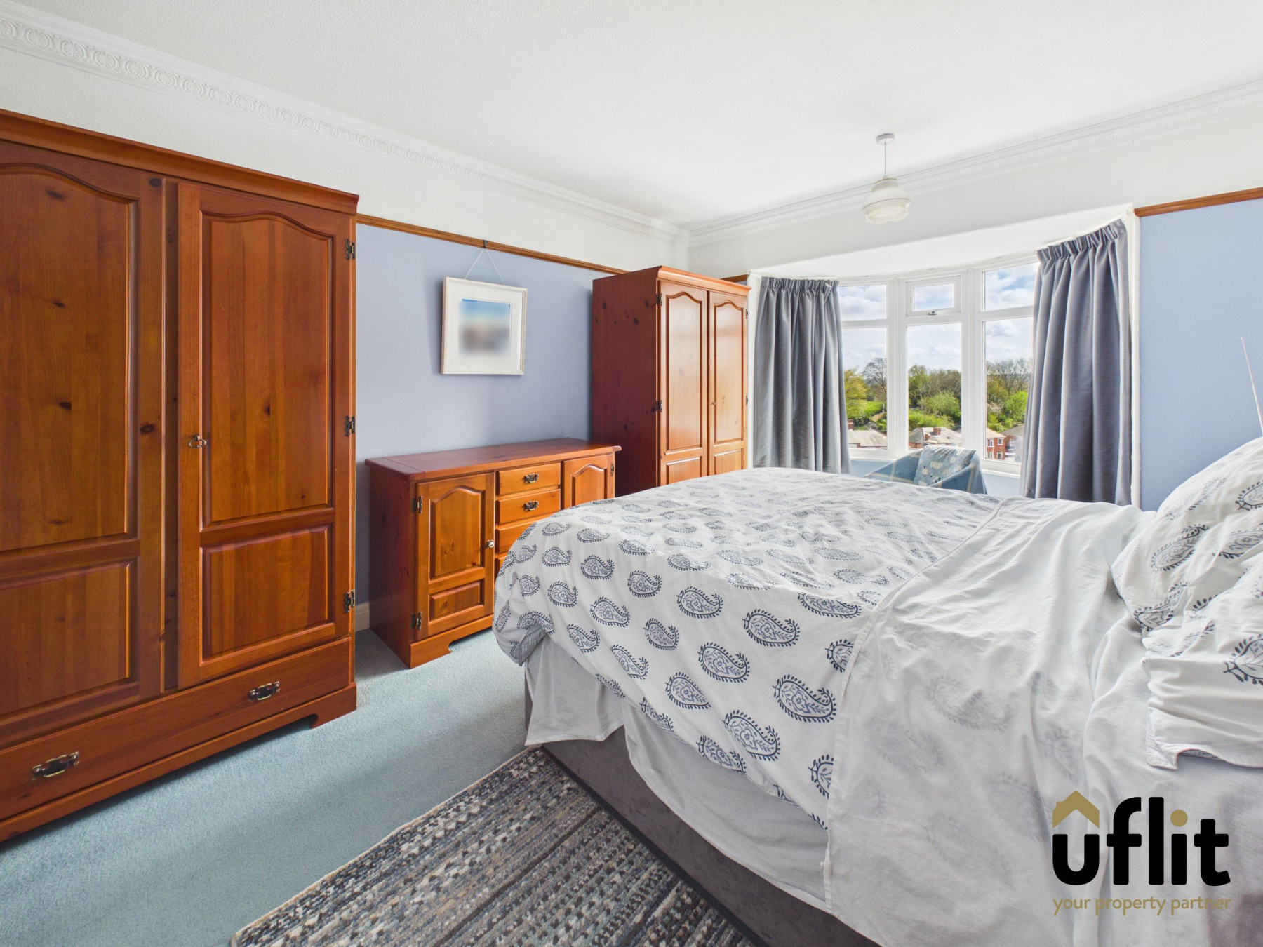 The main bedroom comfortably accommodates a king-size bed featuring carpet flooring and a radiator. A bay window to the rear allows for plenty of natural light and offers a pleasant outlook.