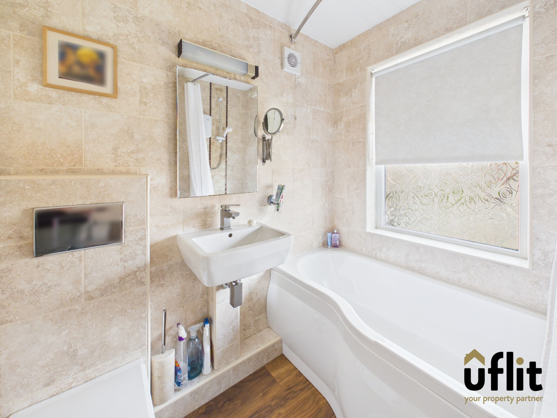 The family bathroom is finished to a high standard, featuring a bath with shower over, low level WC, fully tiled walls, a contemporary floating wash basin and built-in storage.