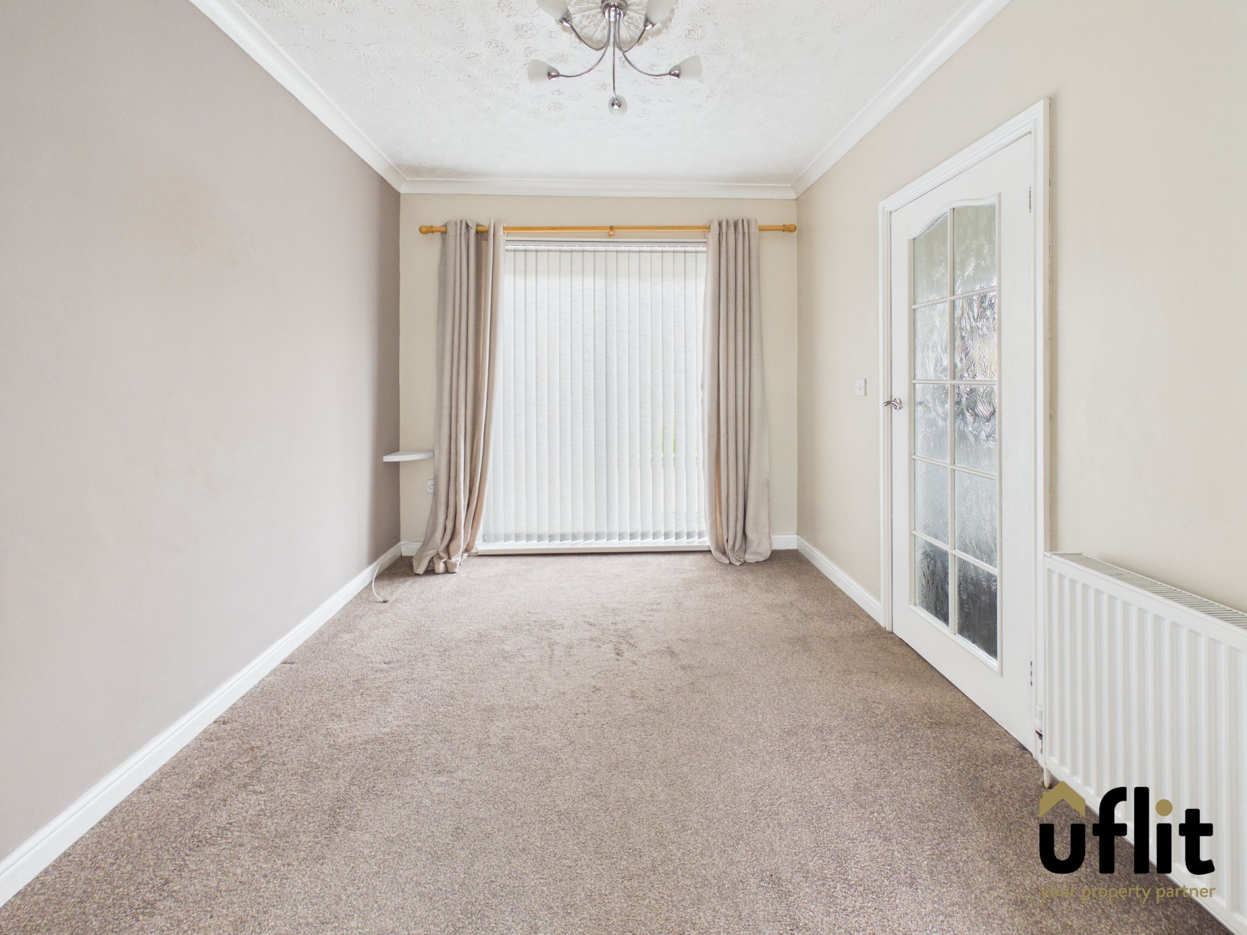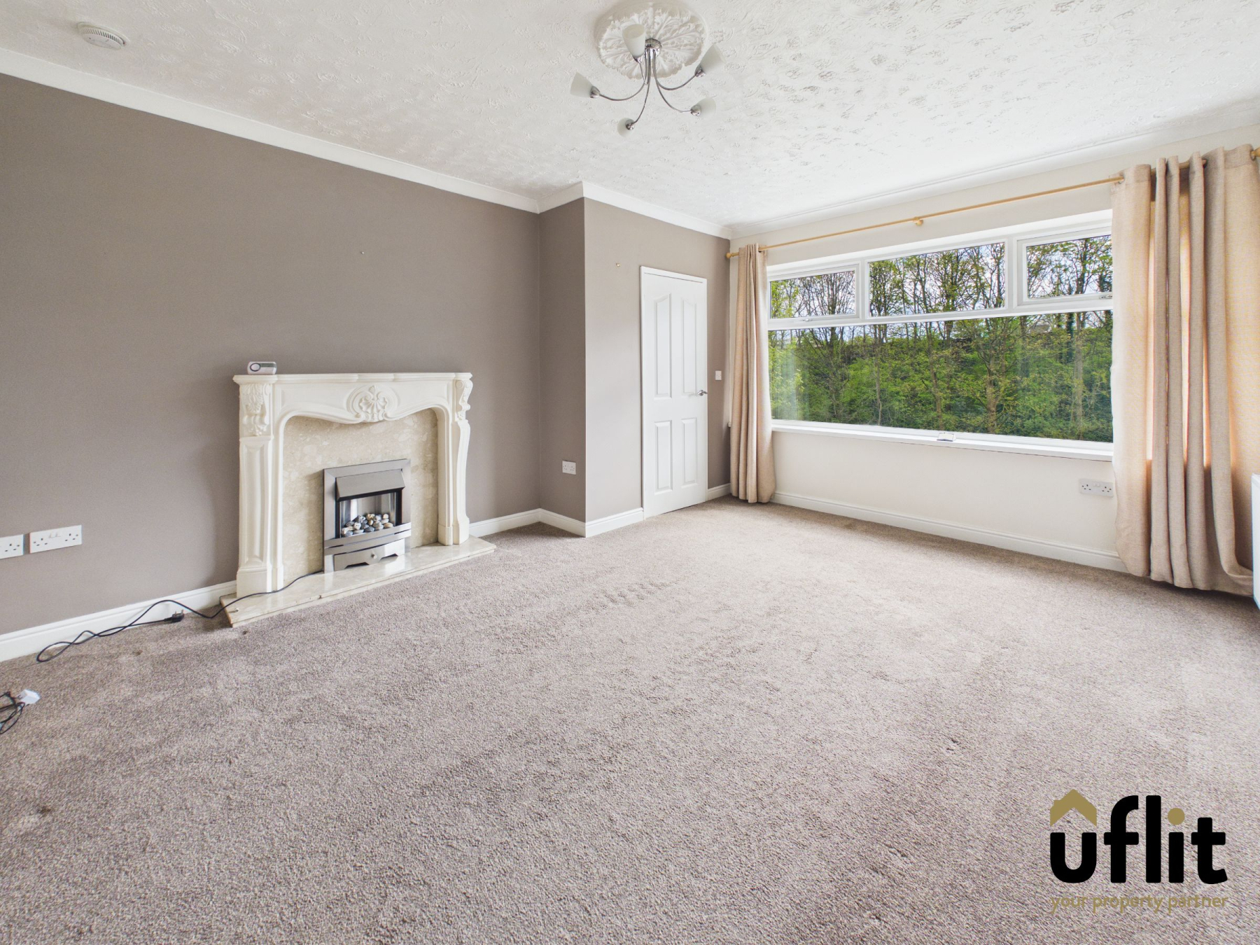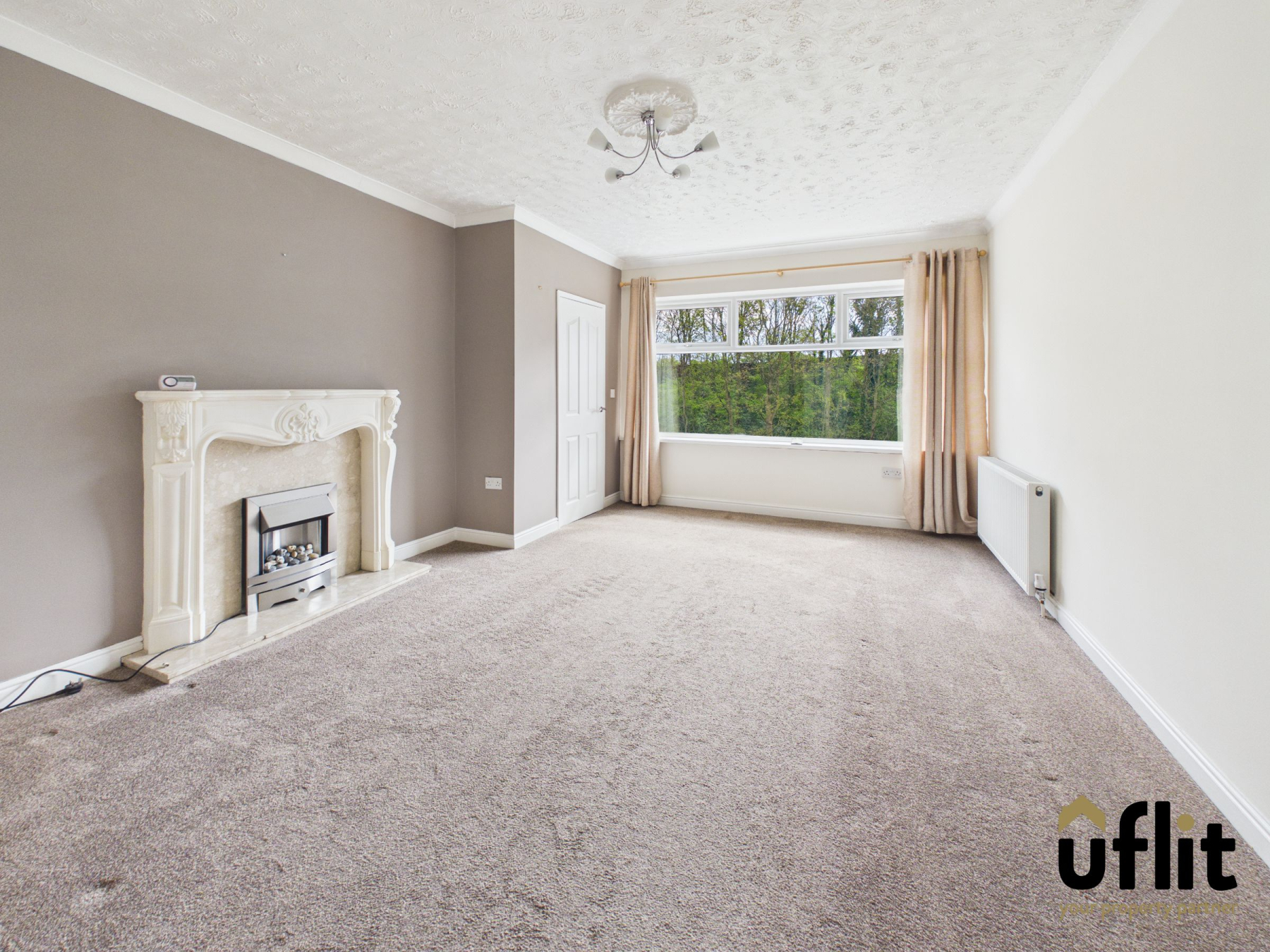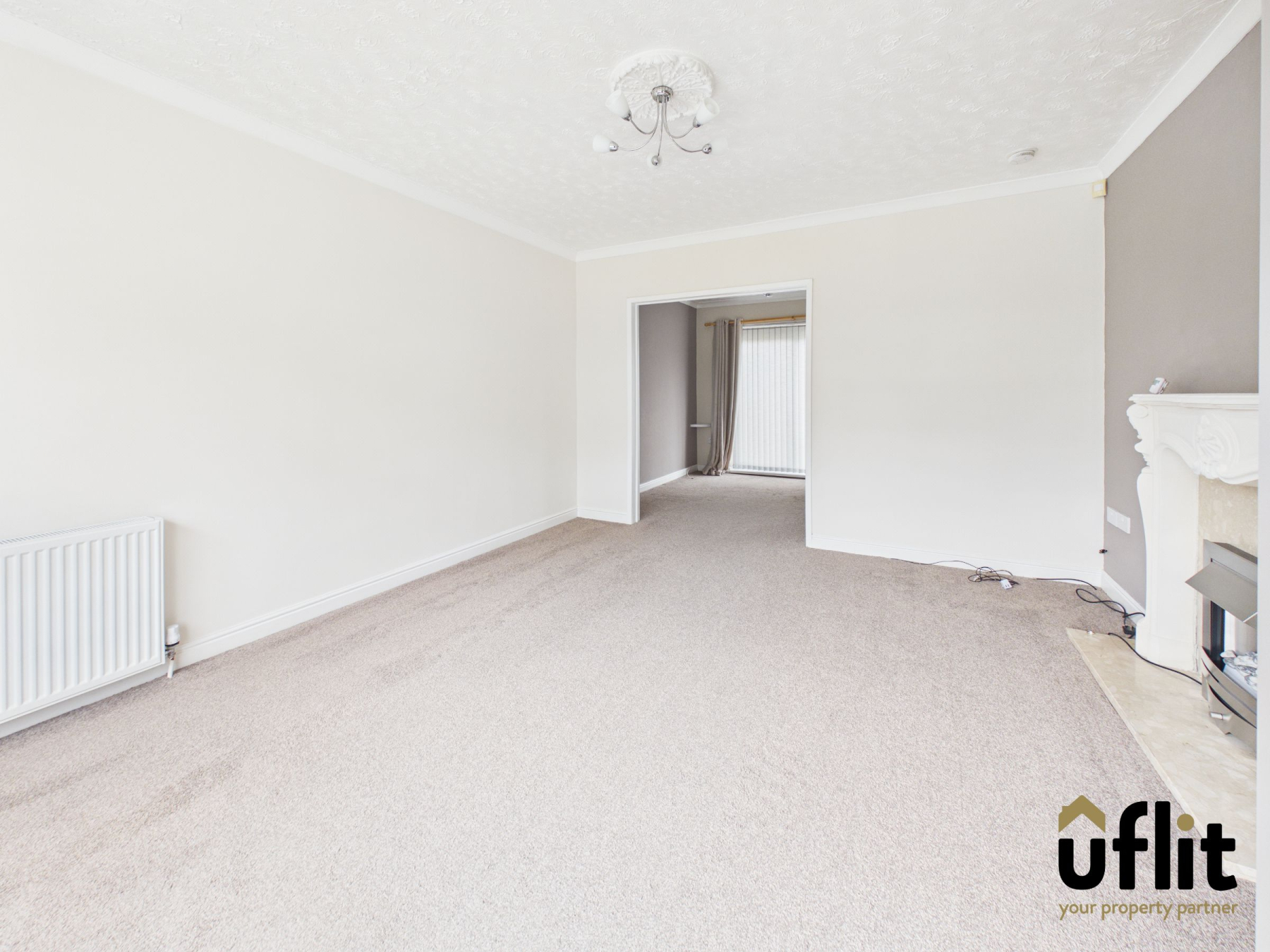 A spacious and inviting living area positioned to the front of the property, featuring a large window that fills the room with natural light. The focal point is an electric fire with decorative surround, creating a cosy atmosphere. The room is finished with carpet flooring and a radiator, with an open archway connecting through to the dining area, enhancing the sense of space. A further door leads through to the front entrance hallway.