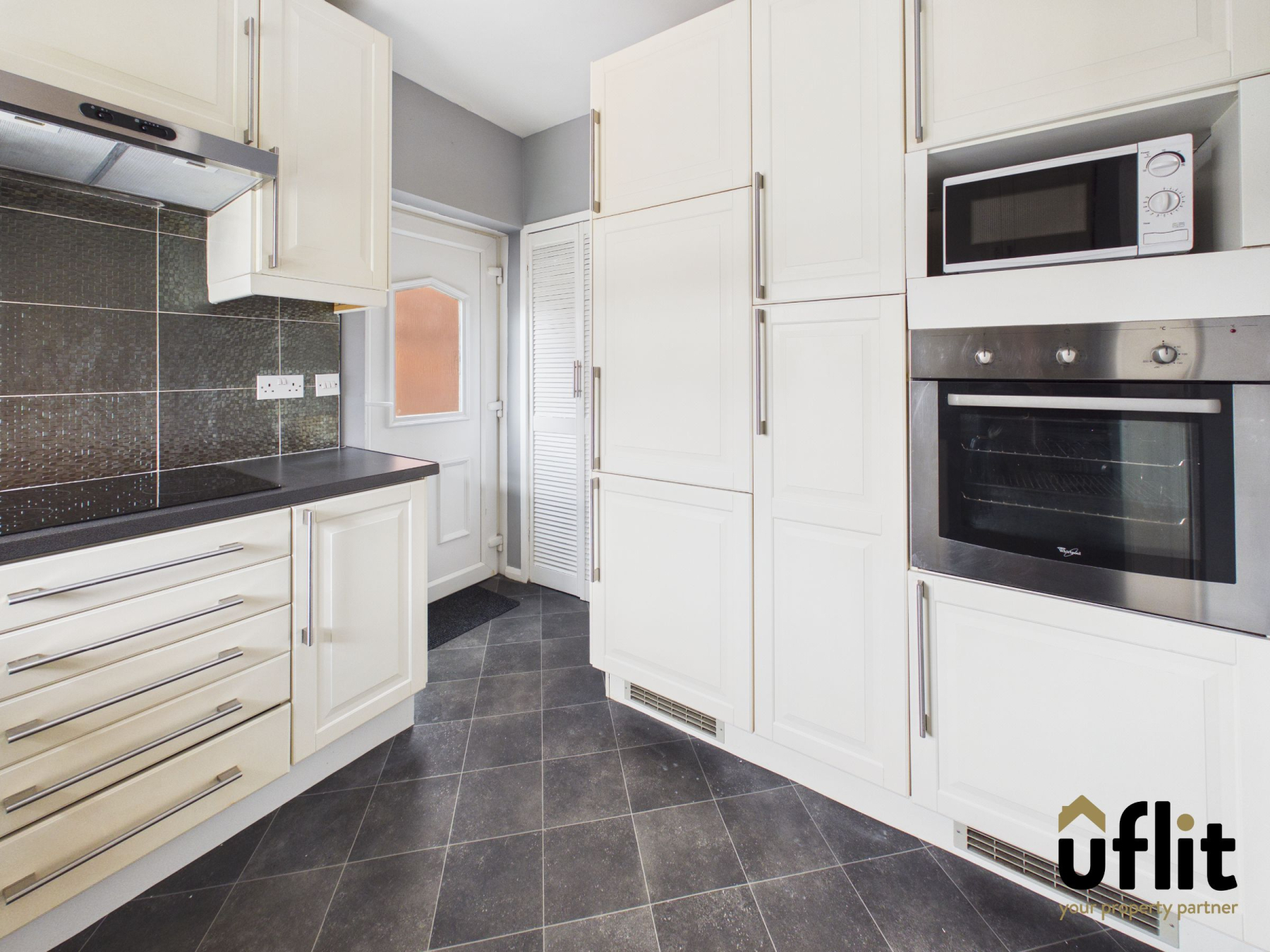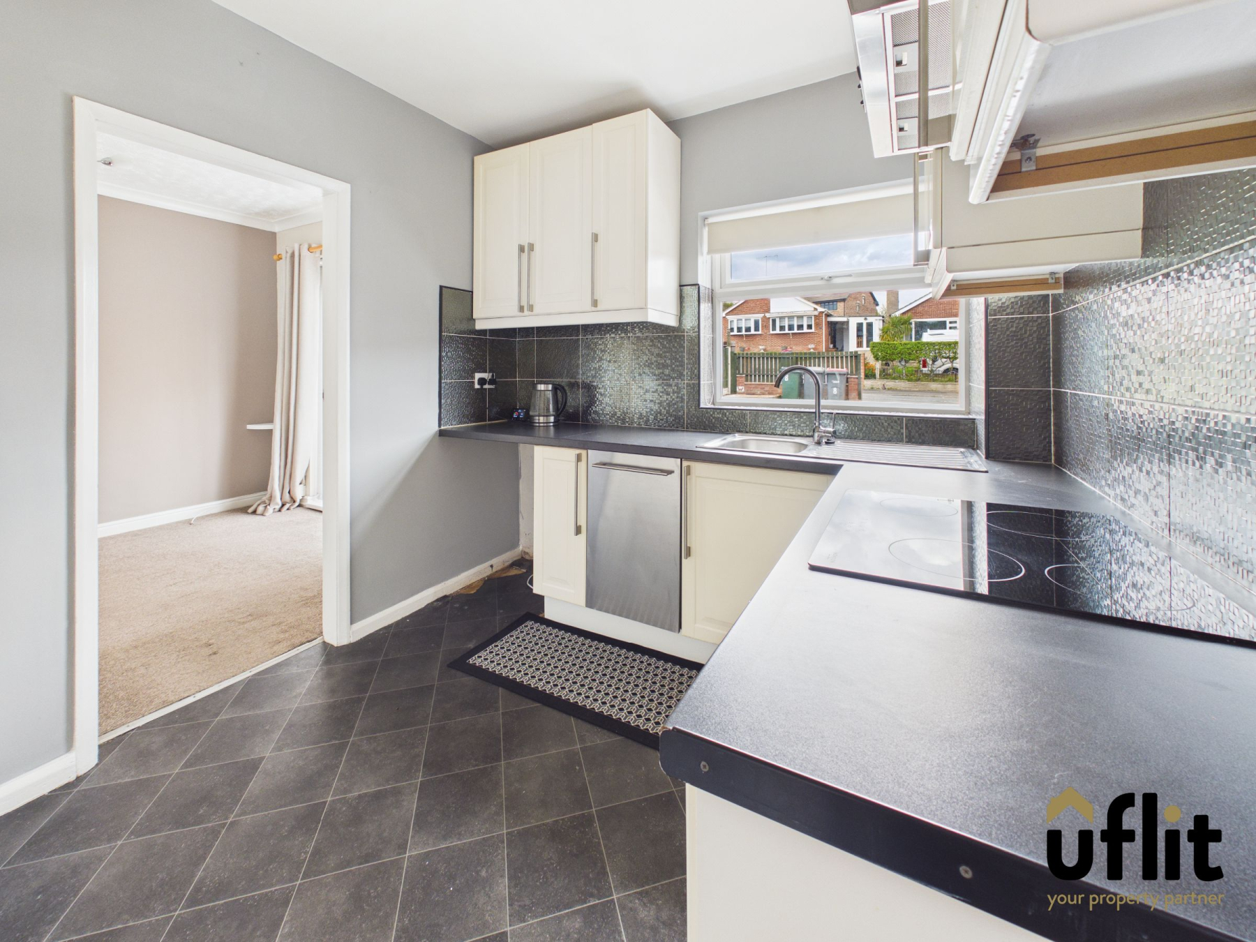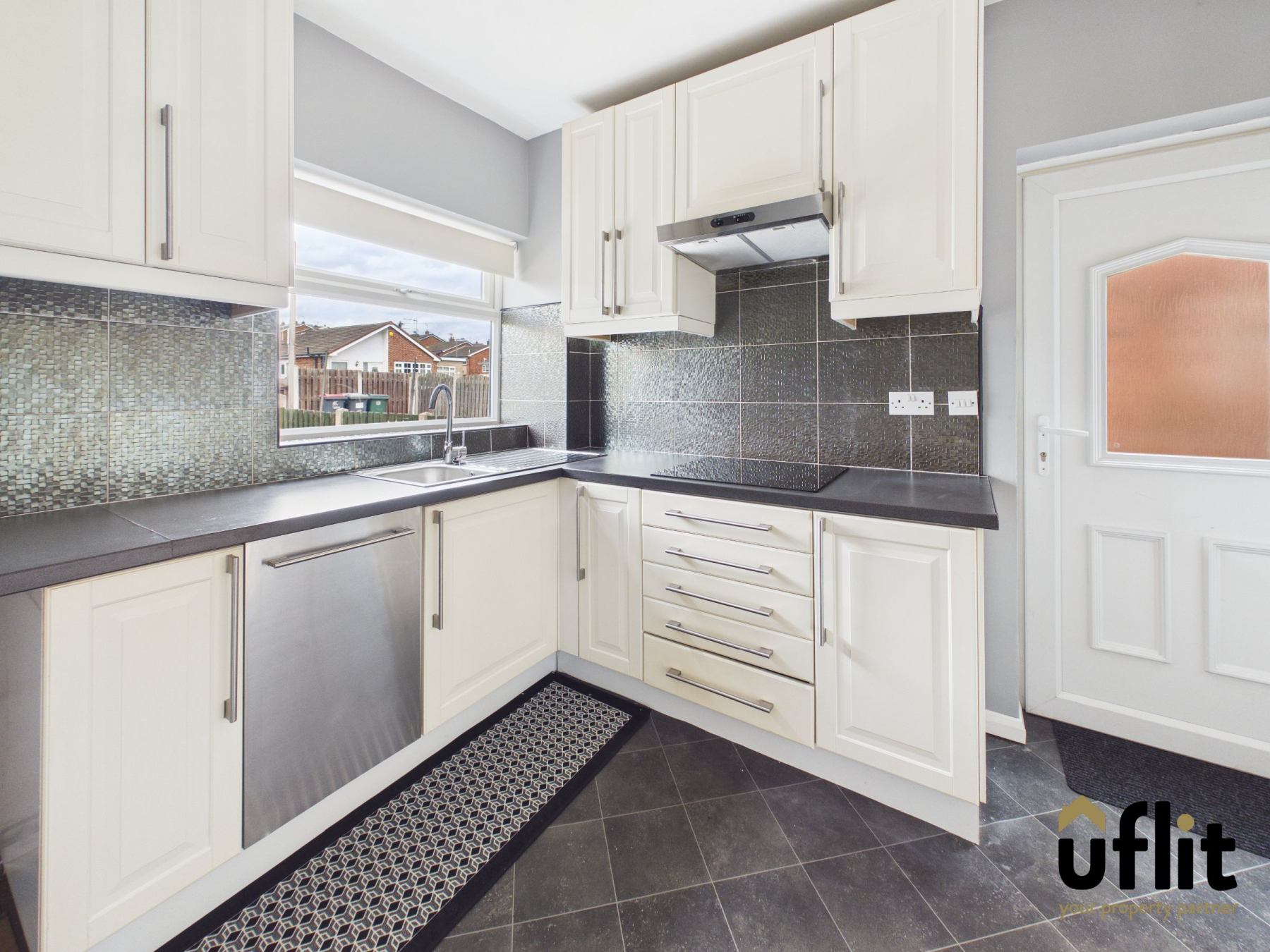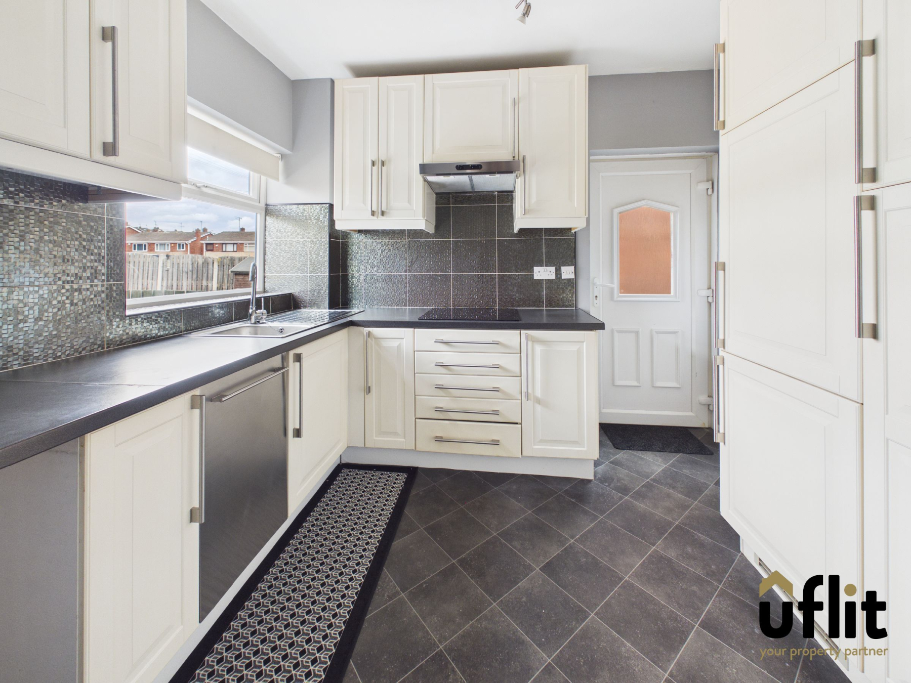 A well-appointed kitchen fitted with a range of units and partially tiled walls, offering both style and practicality. A side door provides direct access from the block paved driveway, while a rear-facing window allows for natural light. The kitchen benefits from an integrated electric oven, ceramic hob, dishwasher and fridge freezer,