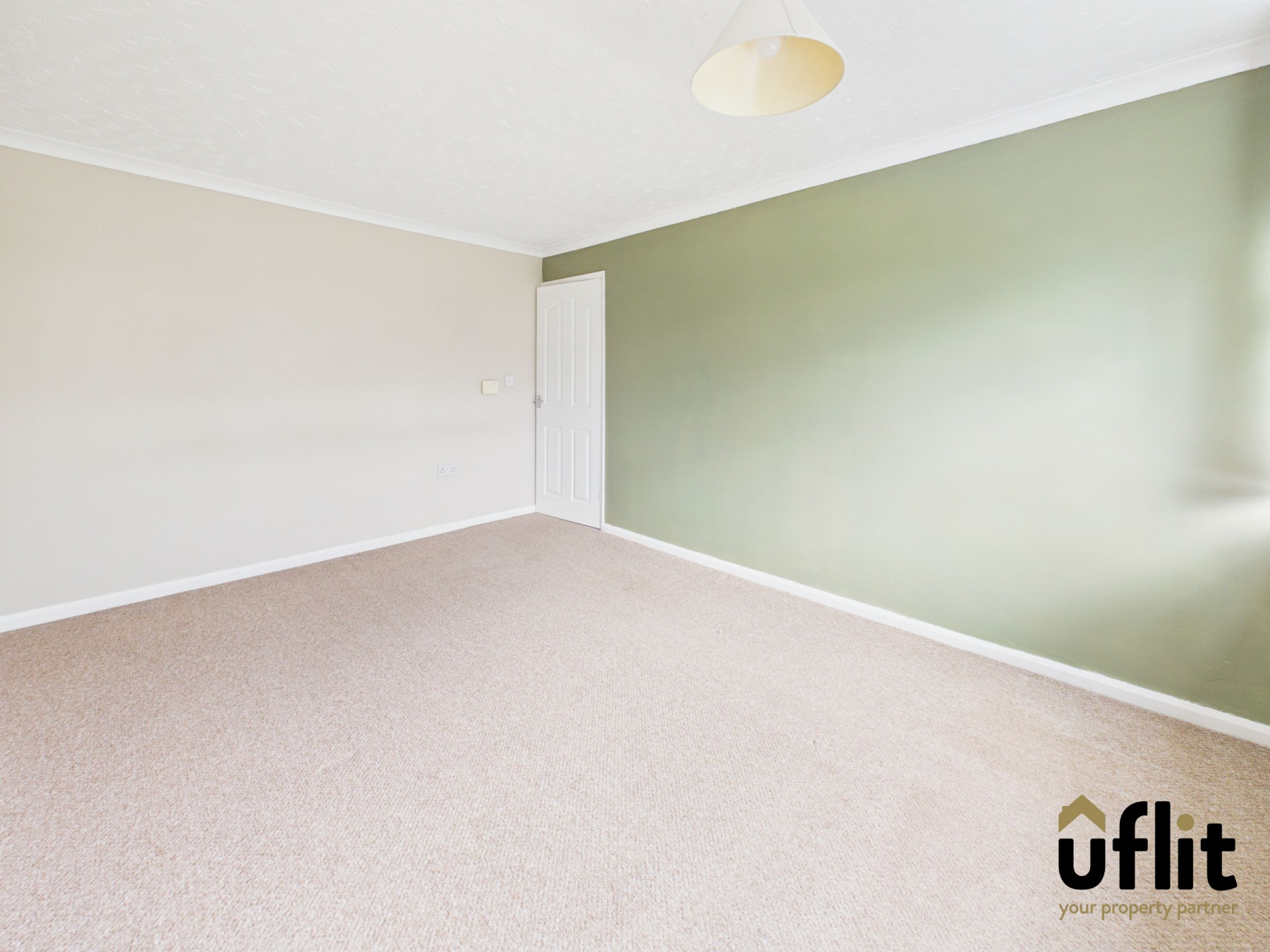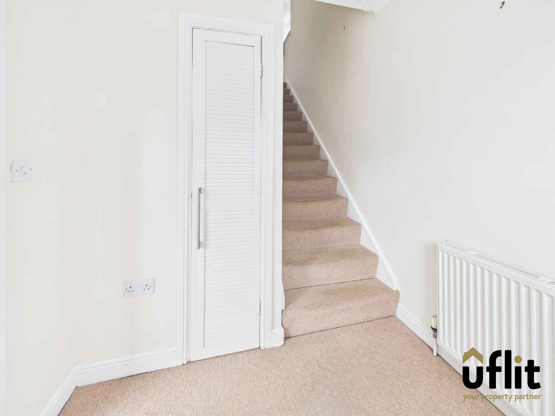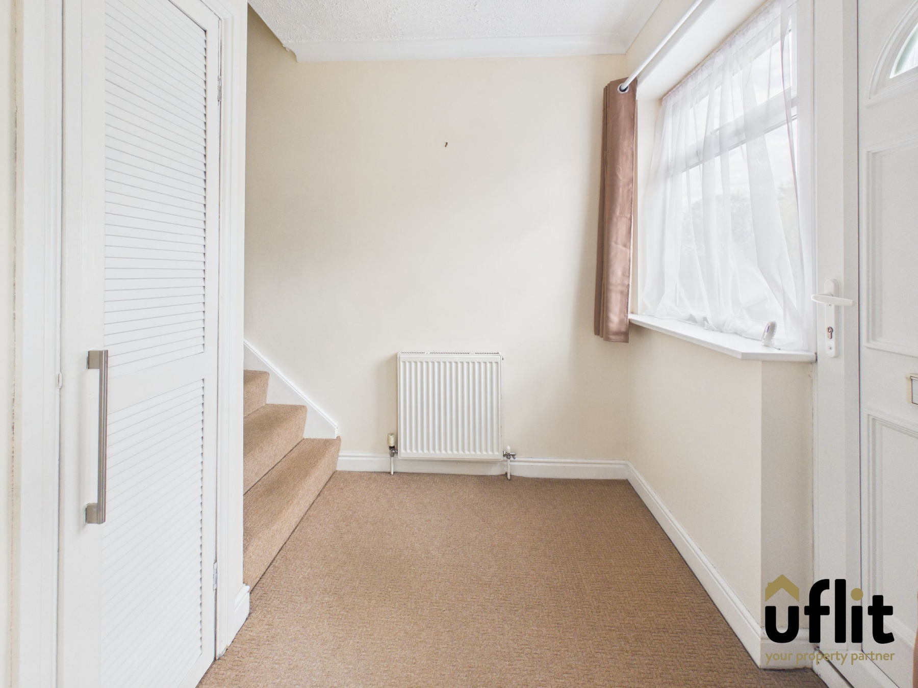 Entered via the front door, the hallway provides access to the lounge and staircase to the first floor. A front-facing window adds natural light, while a built-in storage cupboard offers practicality. Finished with carpet flooring and a radiator.