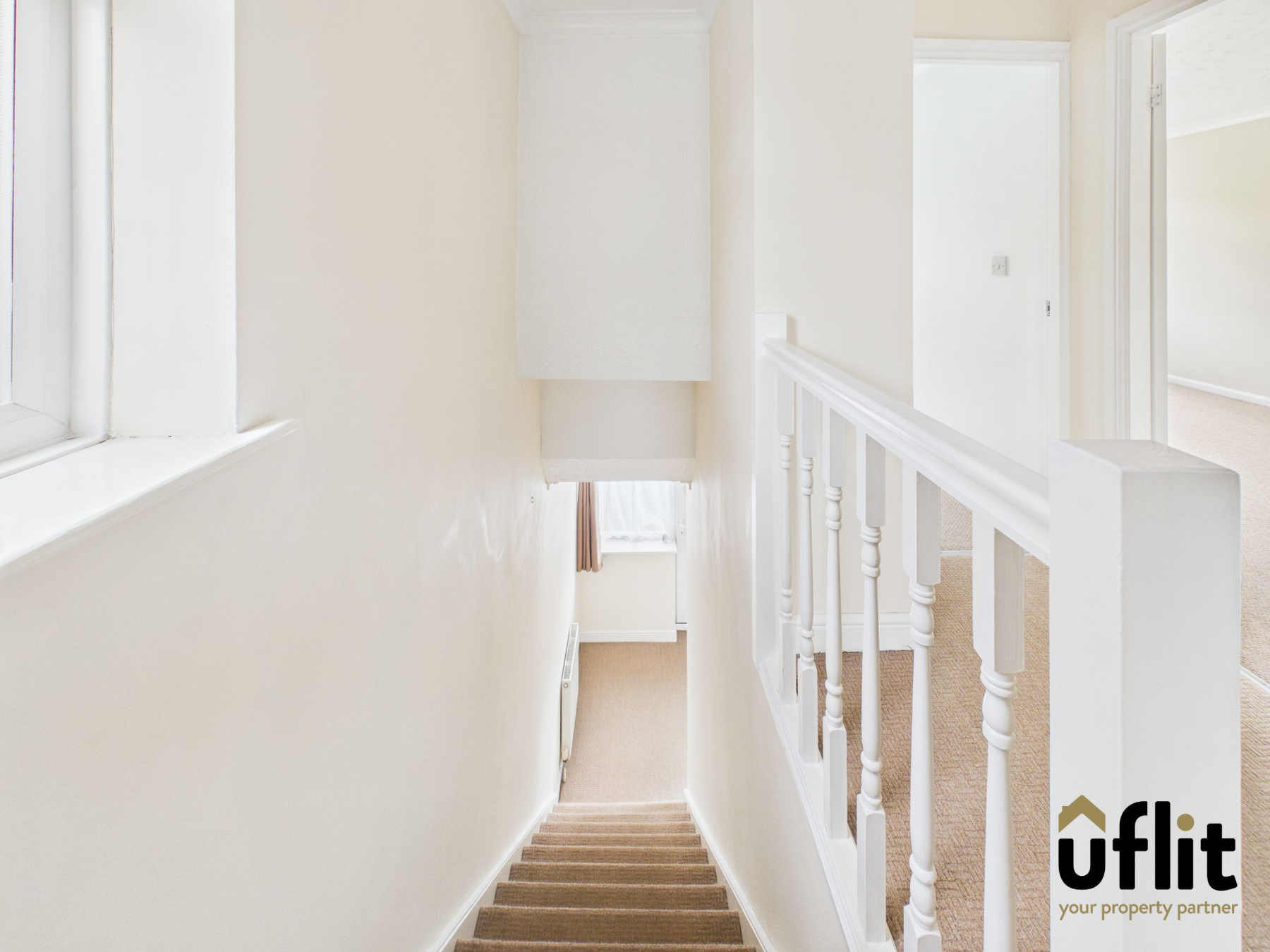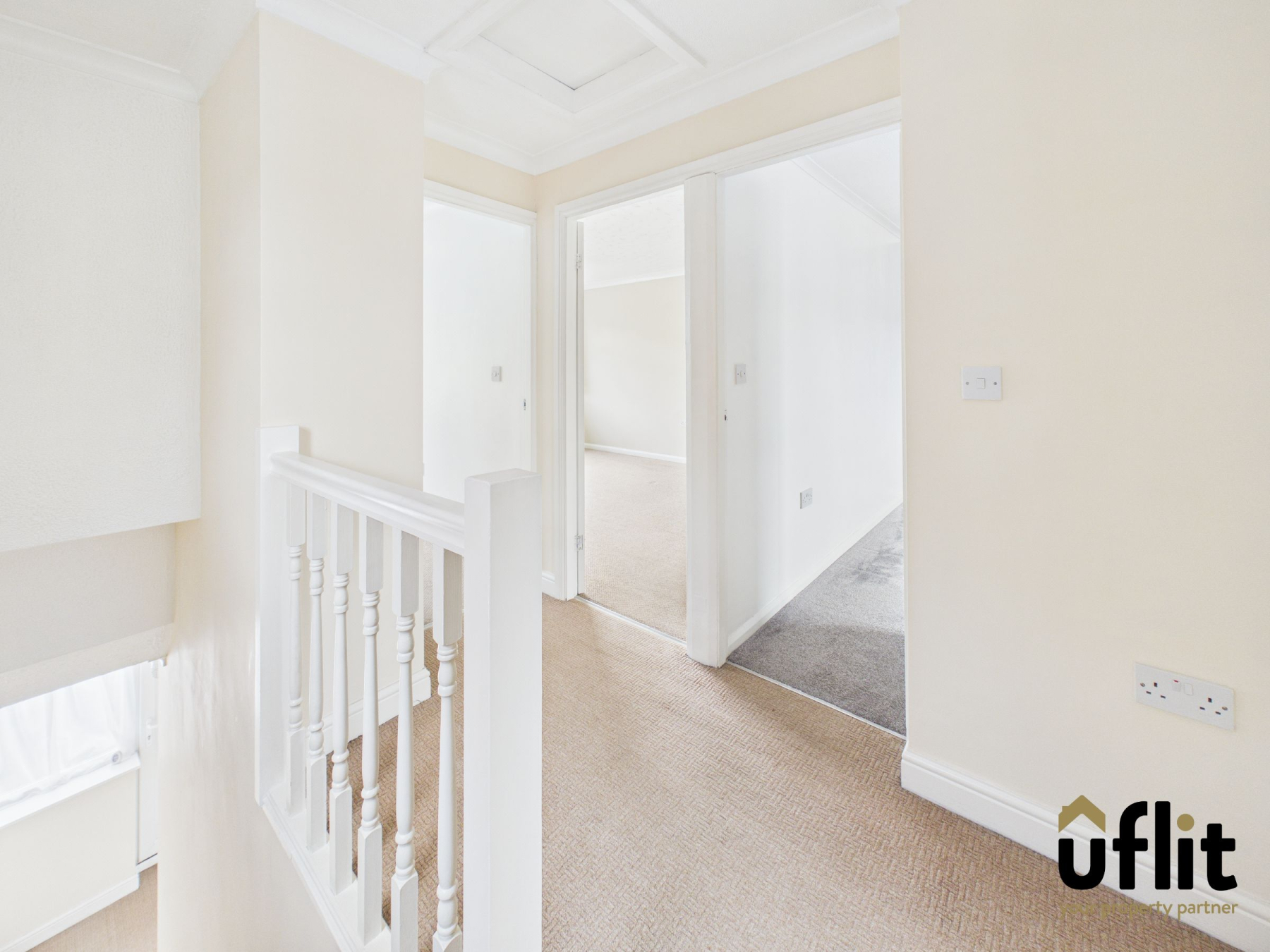 The landing provides access to all first-floor rooms and benefits from a side-facing window at the top of the stairs, allowing light to flow through the space. Finished with carpet flooring.