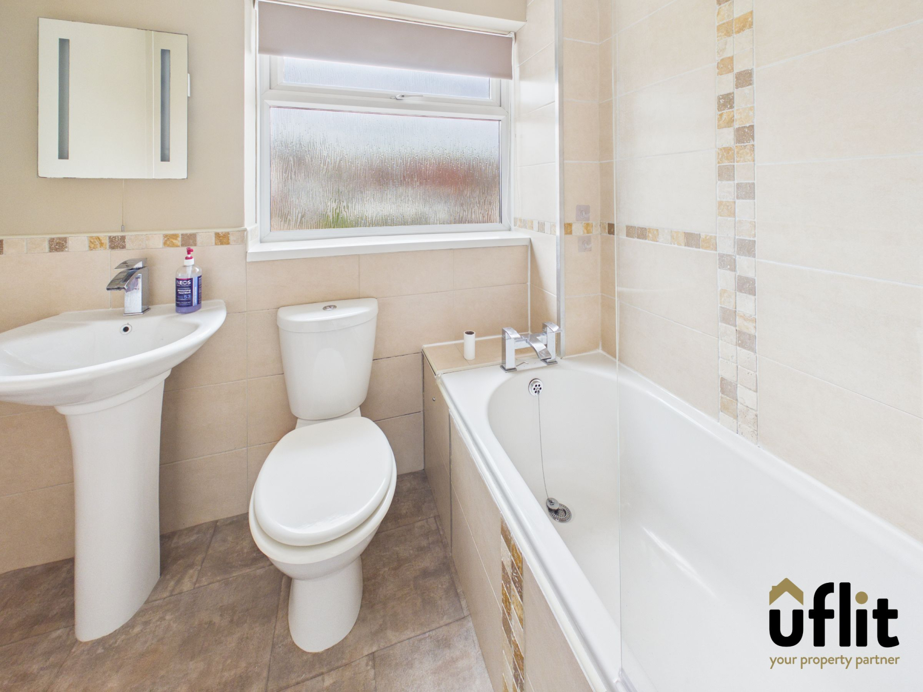 The family bathroom is fitted with a three-piece suite comprising a bath with shower over, wash basin and WC, complemented by partial tiling and a useful storage cupboard.