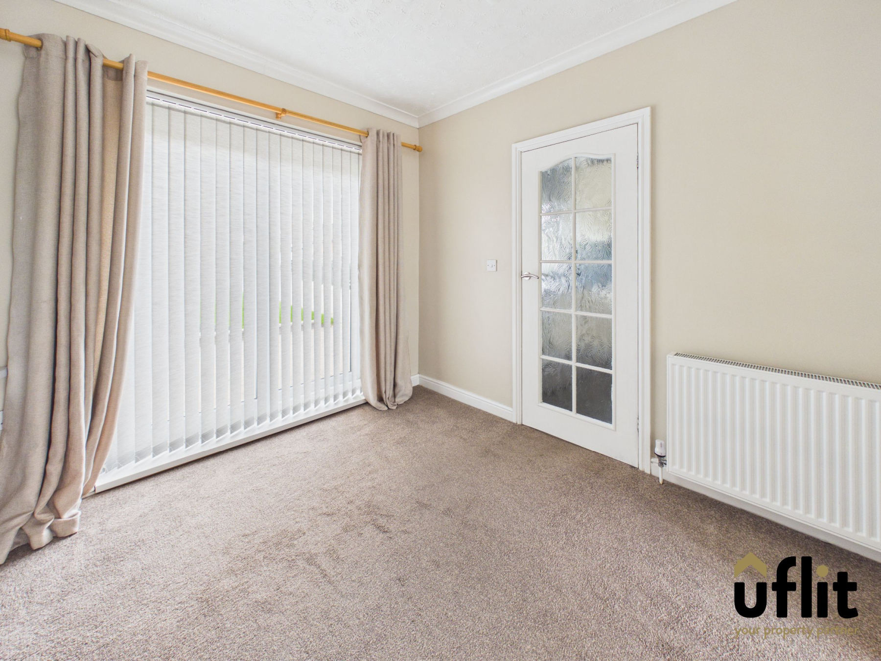 Flowing seamlessly from the kitchen, the dining area provides an ideal space for family meals and entertaining. Sliding doors open out to the rear garden, allowing for a bright and airy feel while offering easy access to outdoor space. Completed with carpet flooring and a radiator.