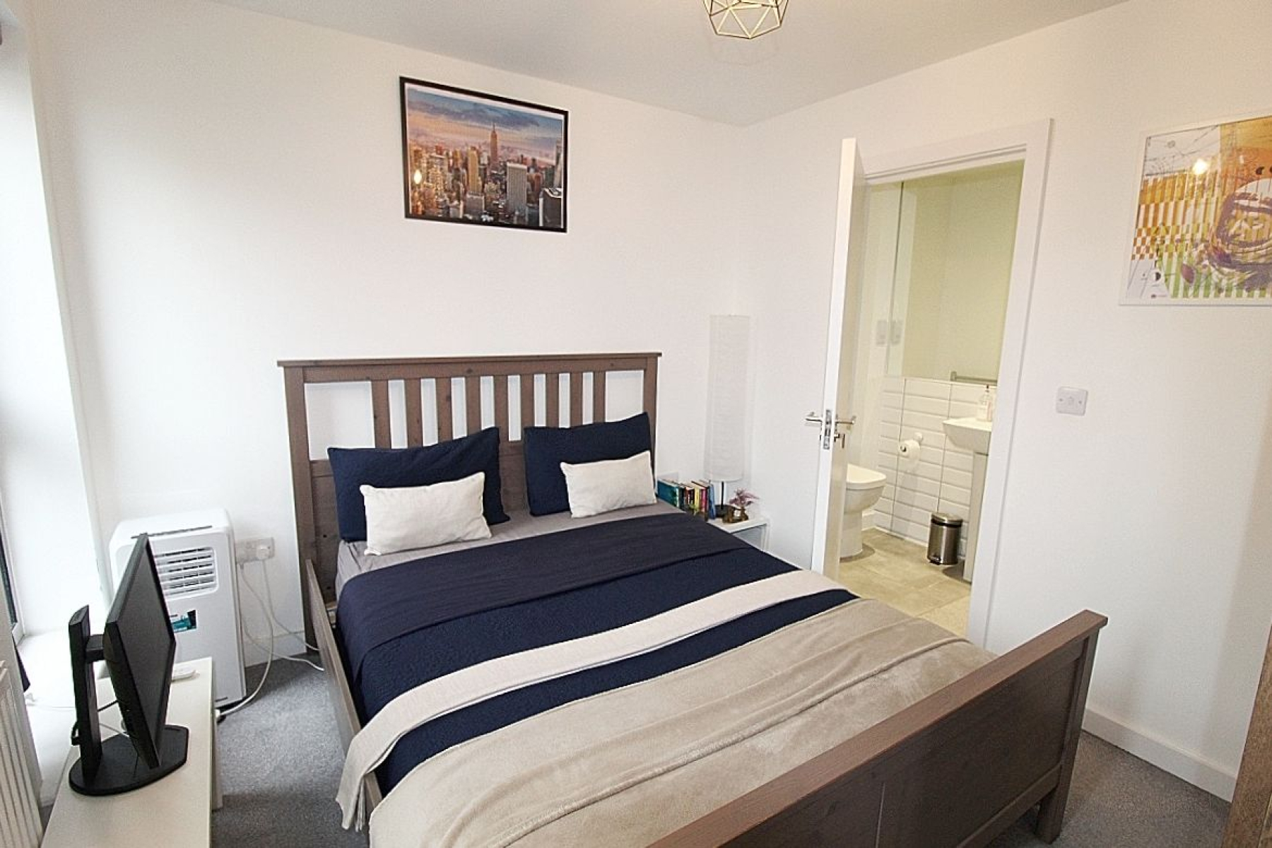 A double bedroom with two front facing glazed windows, carpeted flooring, radiator and door giving access to the ensuite.