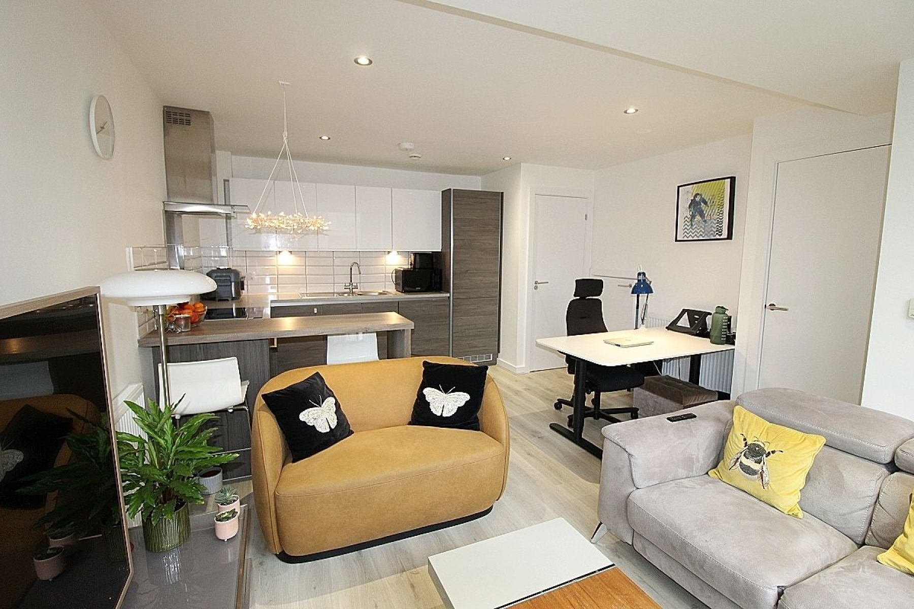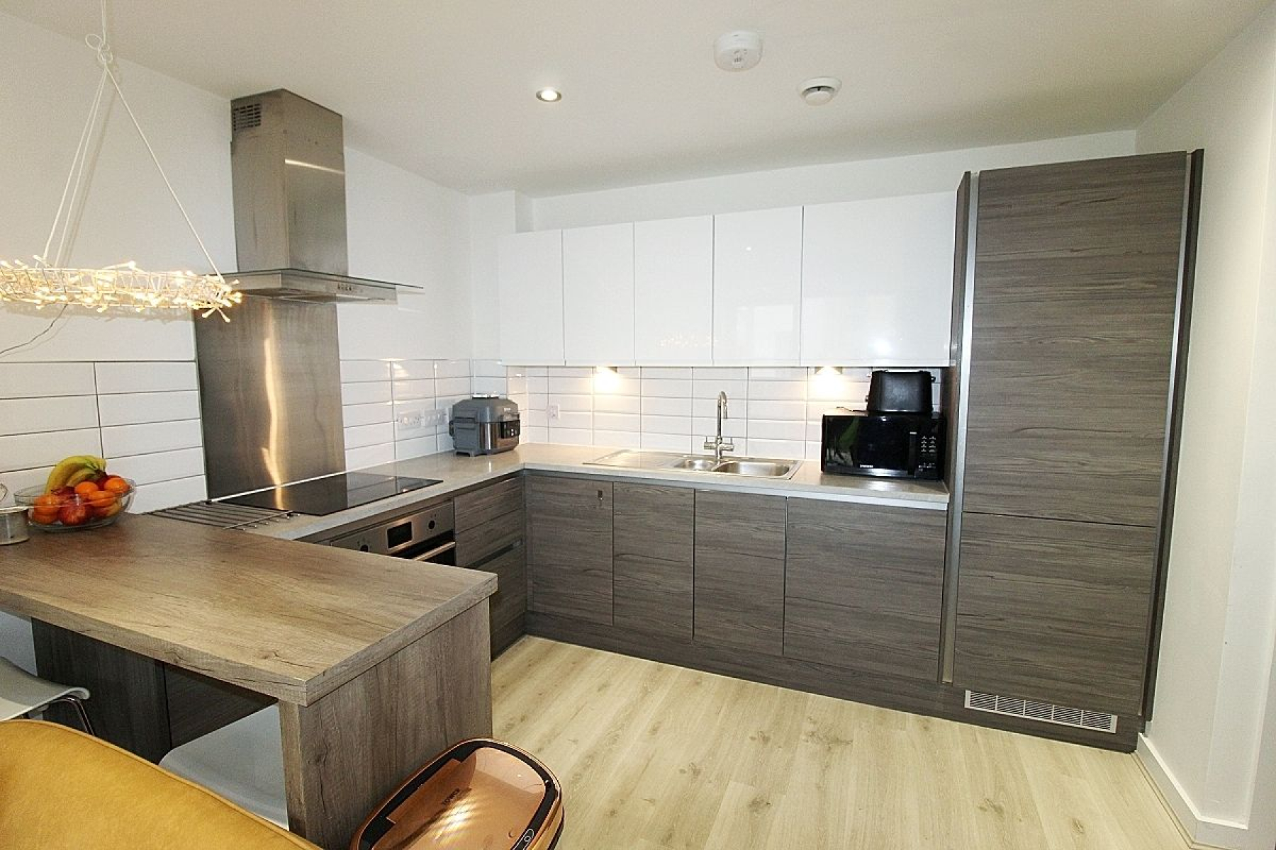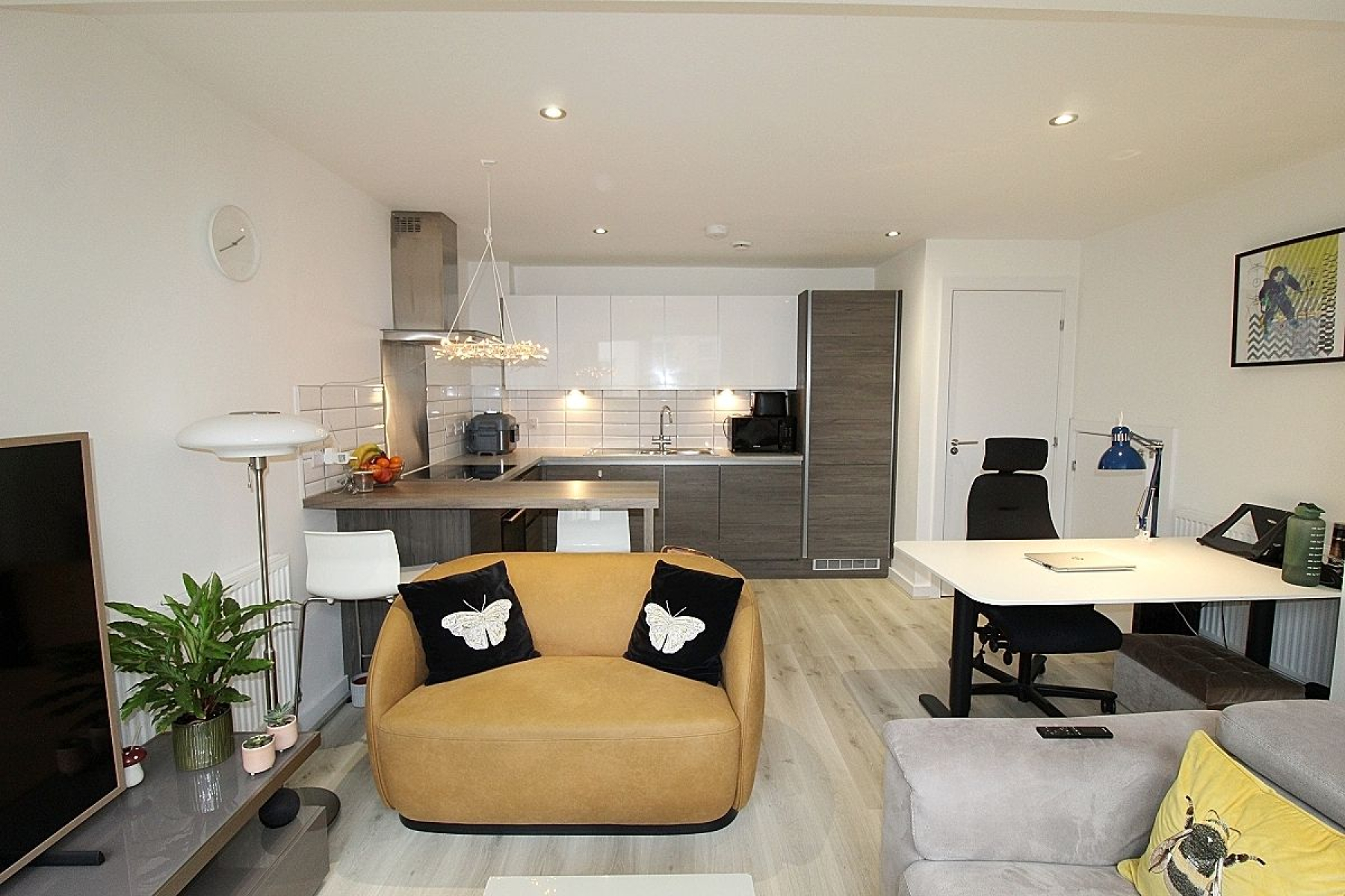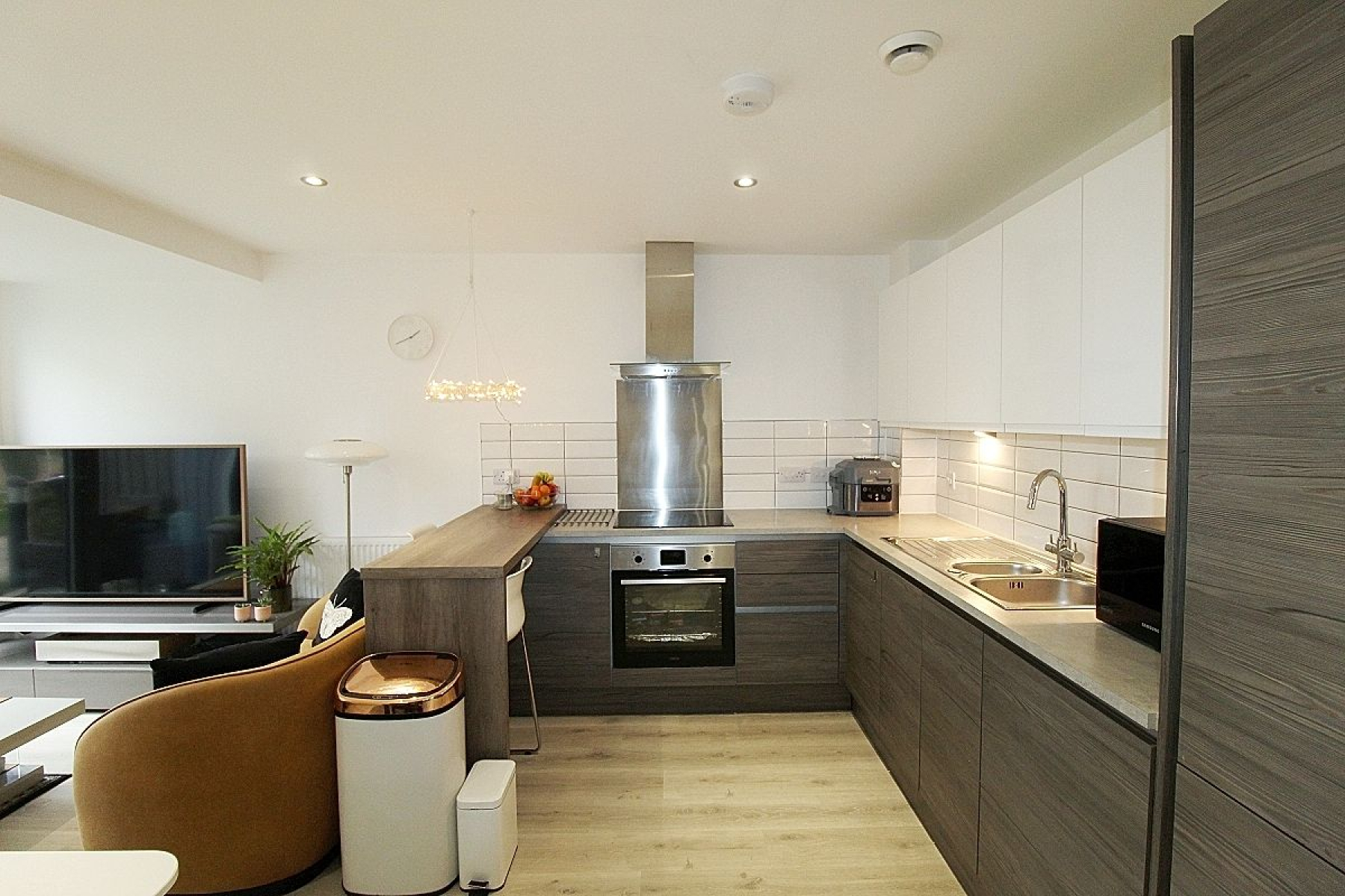 A beautiful high spec kitchen with a range of modern wall and base units with complimentary work surface areas and beautiful tiled back panels with an adjoining breakfast bar with complimentary worktops. Integrated appliances to include a built-in electric oven, induction hob with a stainless-steel back panel and extractor fan, integrated dishwasher and fridge/ freezer. Spot lighting along with a large front glazed window and glazed door to the outside patio really illuminates this space and two radiators add warmth, a continuation of the stunning laminate flooring flows through to the living area. An understairs cupboard houses the washing machine and a door gives access to the wc.
