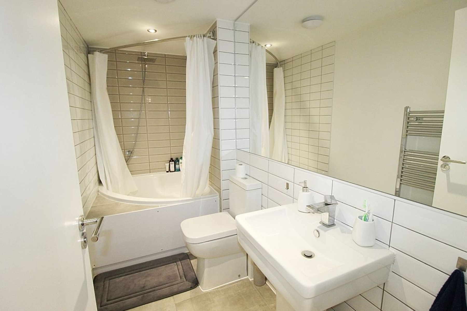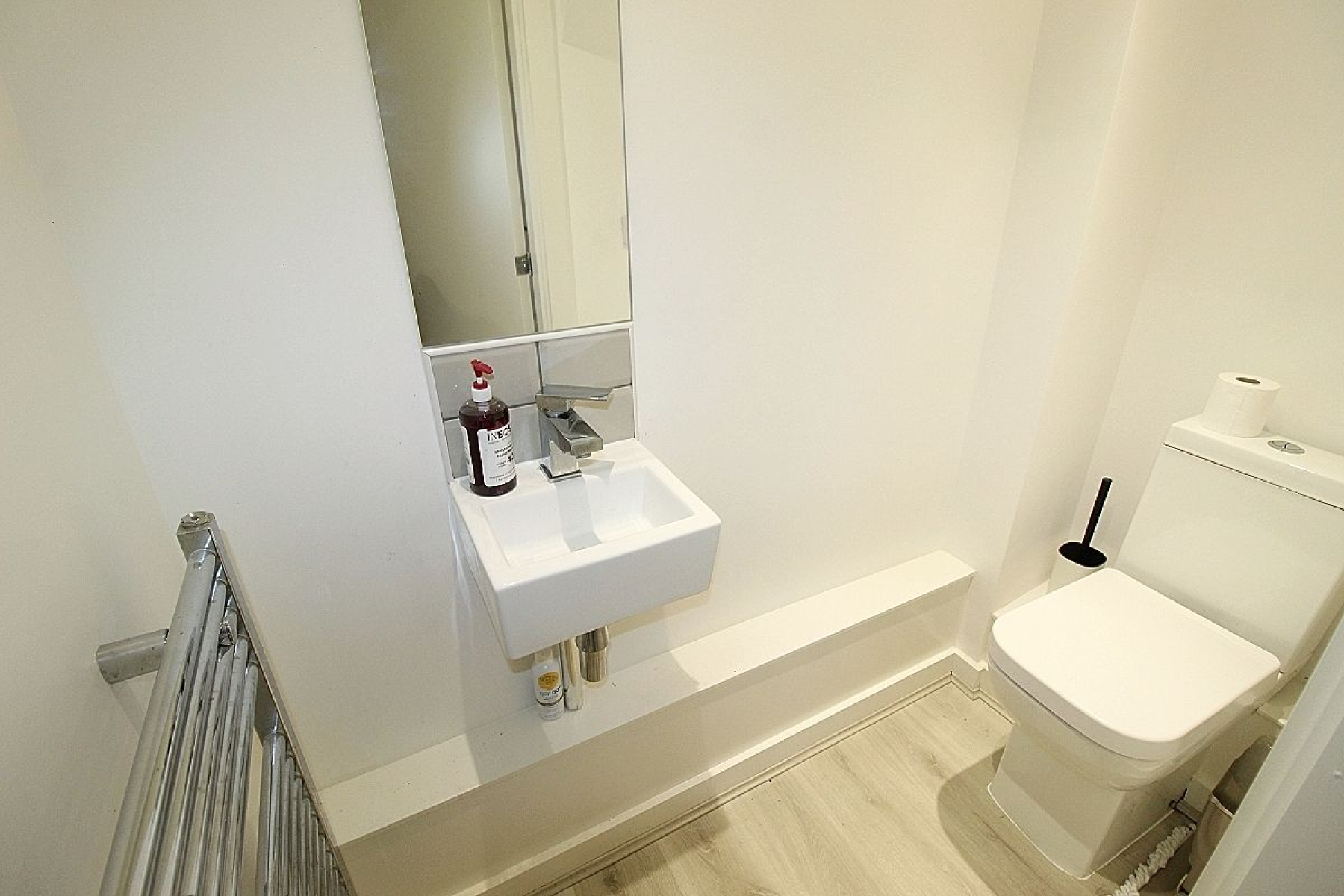 Comprising of a floating wash hand basin, low level wc, a continuation of the laminate flooring, heated towel rail and spot lighting.