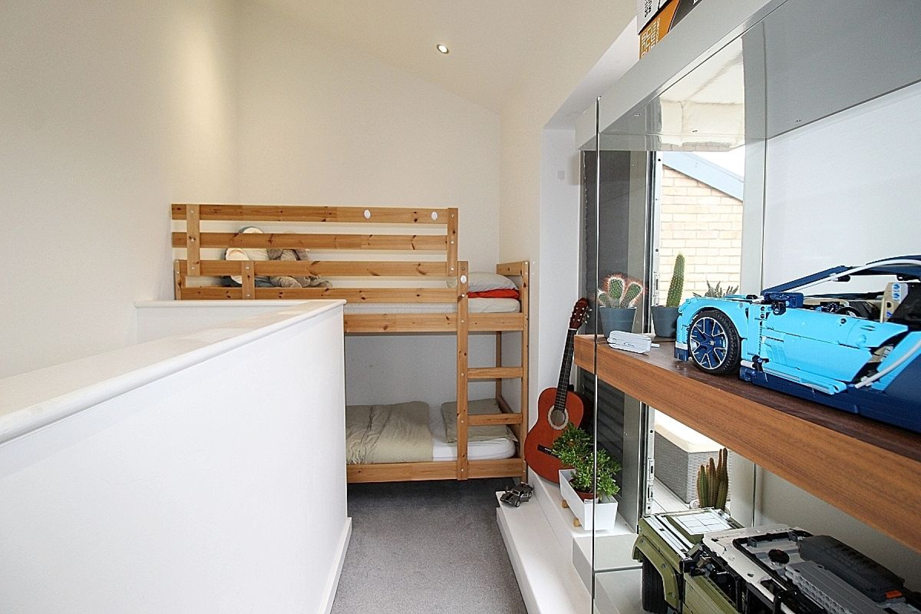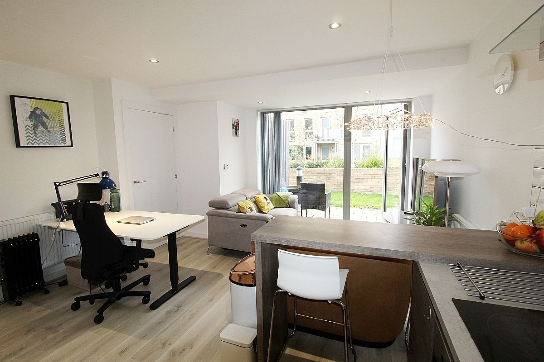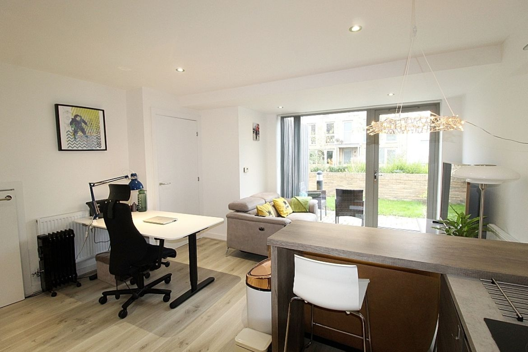 A banister rail creates a parapet to the landing with carpet flowing through to the office/ study area. A glazed door with large glazed side panels opens onto the roof top garden and along with spot lighting creates an abundance of light whilst a radiator adds warmth.