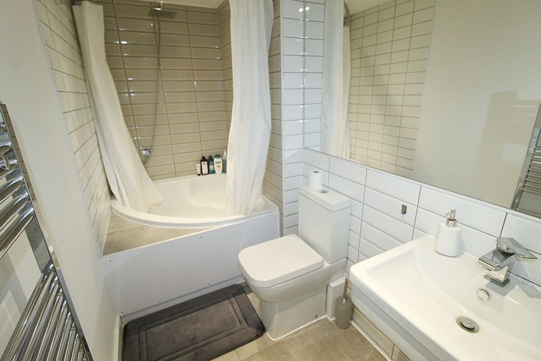 A beautifully appointed modern bathroom comprising of a corner panelled bath, low level wc and wash hand basin with a large mirror above. Modern partially tiled walls with contrasting tiled flooring, spot lights and a wall mounted heated towel rail.