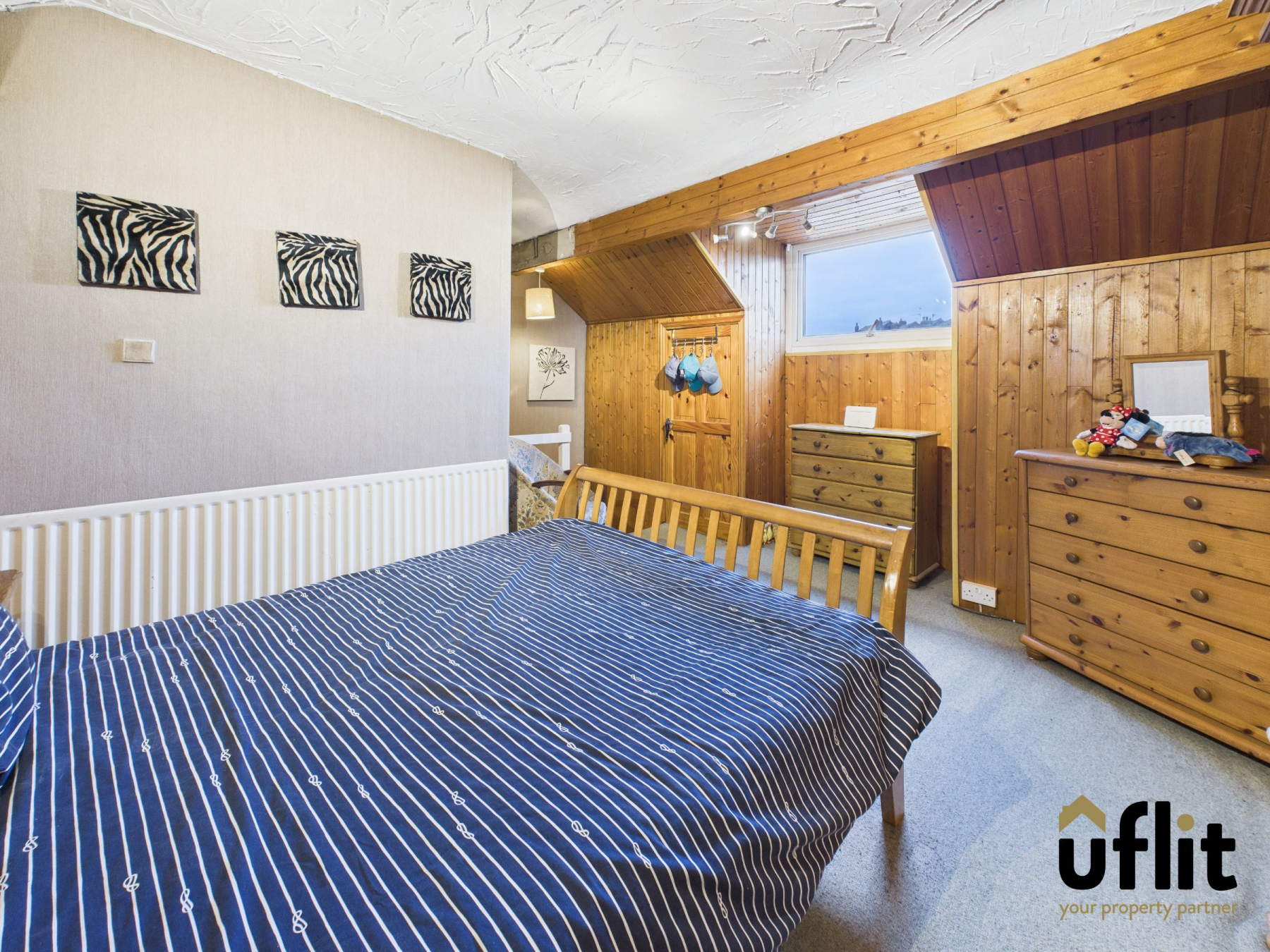 Located on the top floor, this well-presented bedroom includes carpet, radiator, rear-facing window, attractive wood paneling, a fitted wardrobe, chest of drawers, bedside cabinets and eaves storage.