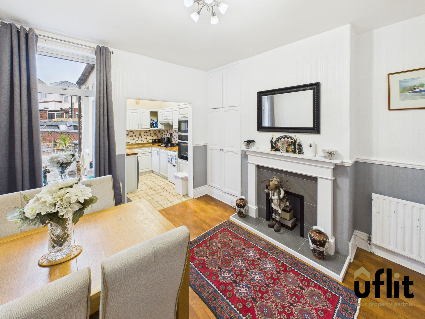 With laminate flooring, rear-facing window and radiator, this space also benefits from built-in storage cupboards and a decorative fireplace with surround and tiled hearth. Doors lead to the lounge and carpeted stairs to the first floor.