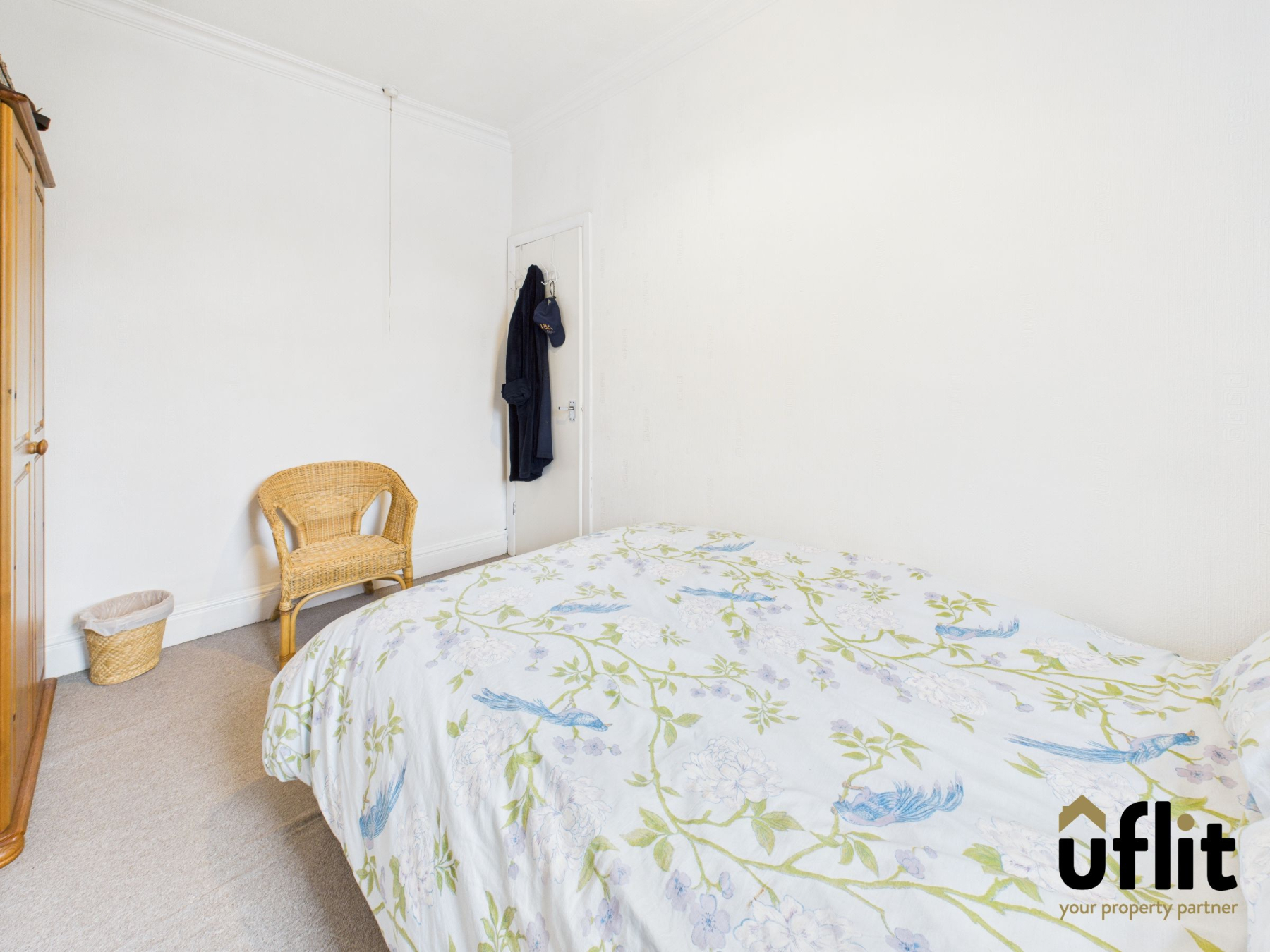 Another spacious double bedroom with rear-facing window, carpet, radiator and decorative coving to ceiling.