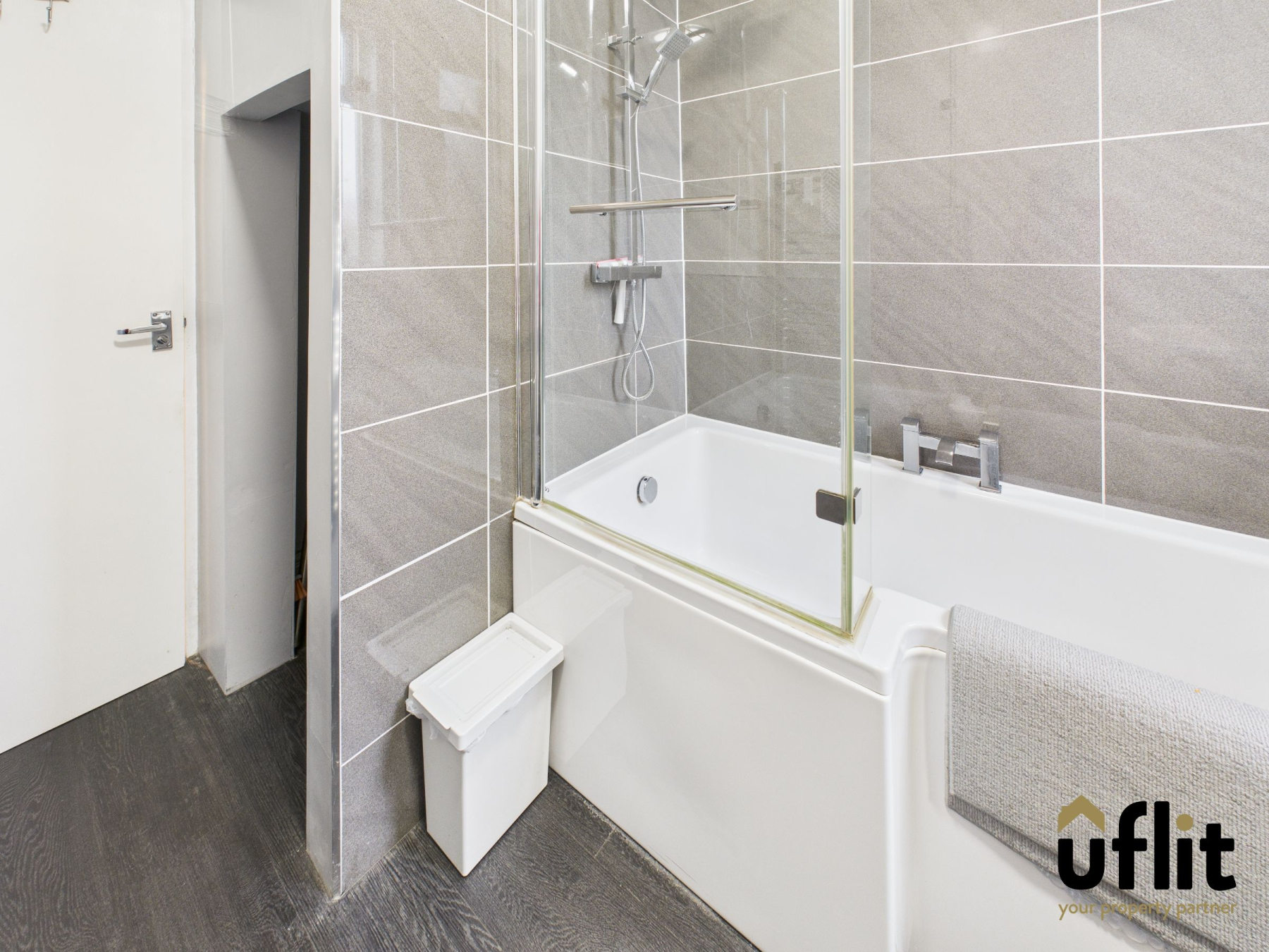 A modern and stylish bathroom suite comprising a P-shaped bath with shower over and glass screen, sink inset into a sleek vanity unit and WC. Fully tiled walls, laminate flooring, chrome heated towel rail and a handy under-stairs storage cupboard.
