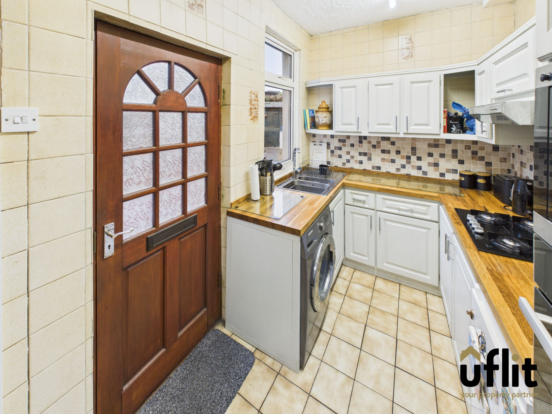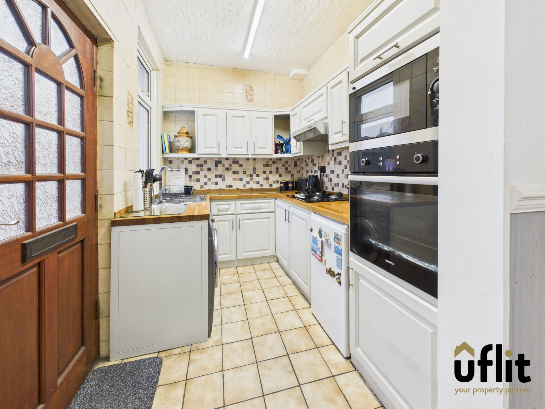 Fitted with a range of wall and base units, wooden worktops and matching upstands, complemented by a tiled splash back. Features a gas hob with extractor, integrated oven and microwave, space for appliances and a side-facing window. Tiled flooring and a rear door provide access to the garden, with an open archway to the dining room for a connected feel.