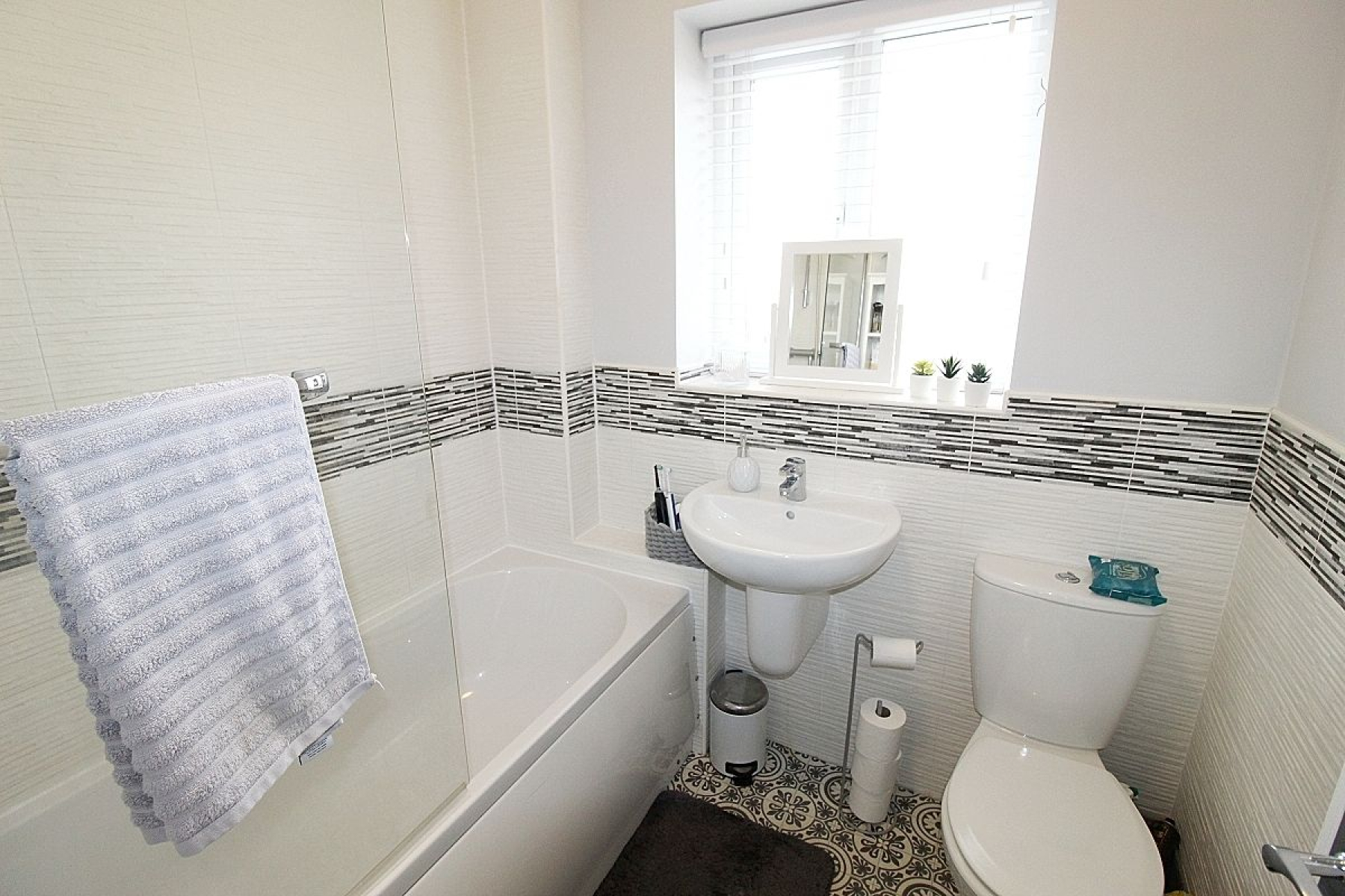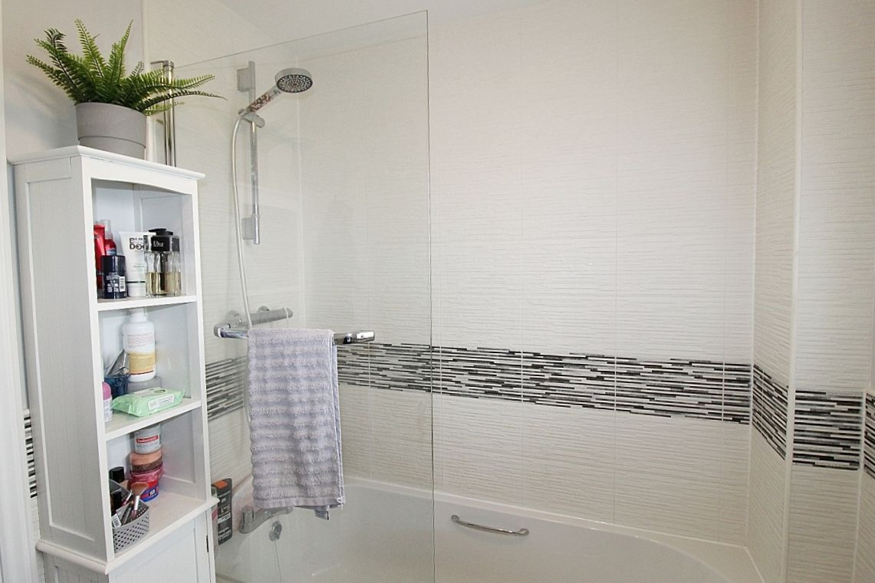 A contemporary styled bathroom, comprising of panelled bath with overhead shower and screen, low level wc and a floating wash hand basin. Partially tiled to walls with attractive feature borders, vinyl flooring, radiator and a front facing upvc window.