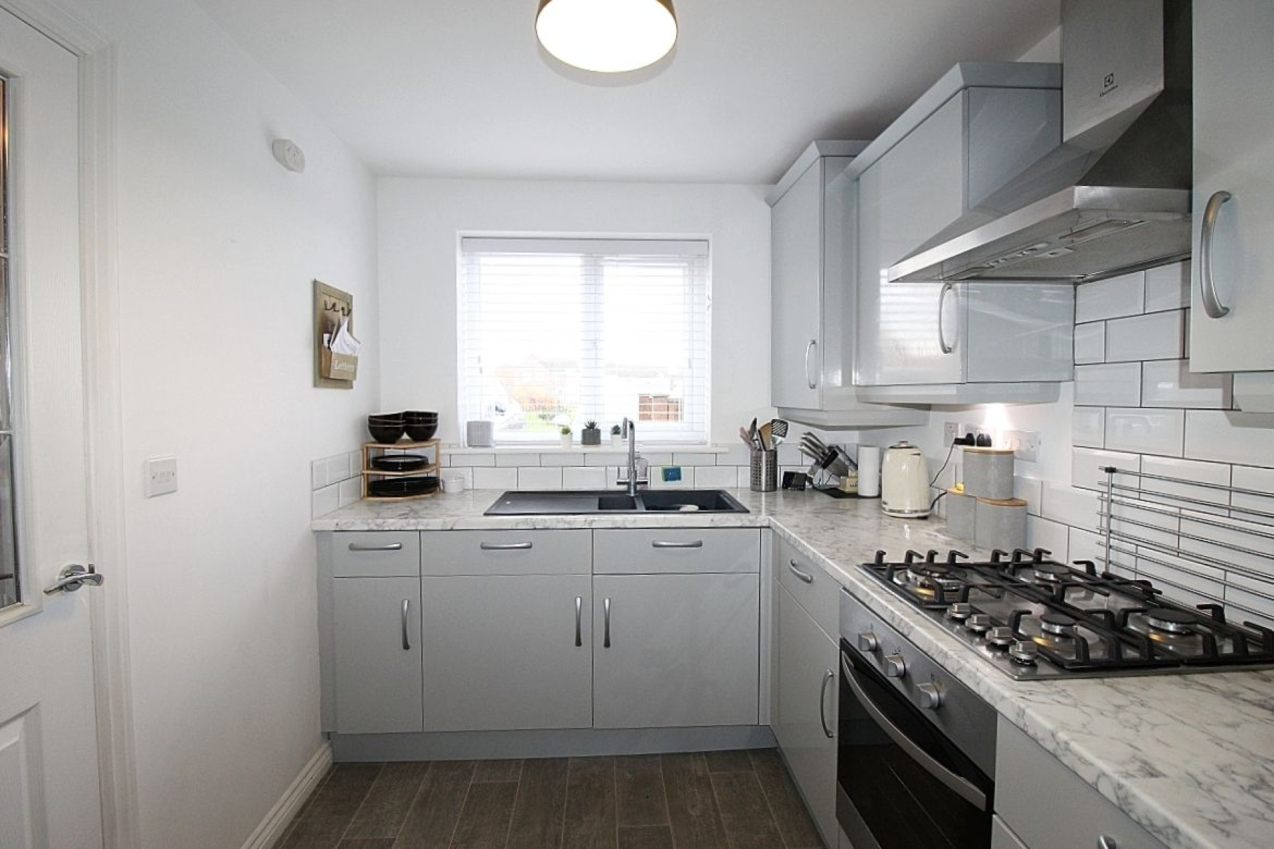 A modern kitchen with a range of wall and base units with complimentary work service areas and tiled back panels. Appliances to include a built in oven, gas hob, extractor fan, integrated fridge freezer and washing machine, front facing upvc window, vinyl flooring and radiator.