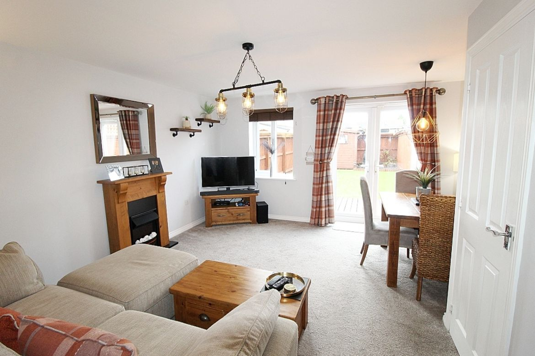 A beautifully presented living area with an attractive feature fire place, carpeted flooring, two radiators add warmth, a upvc rear facing window along with French doors giving access to the rear garden illuminate and a large under stairs storage cupboard.