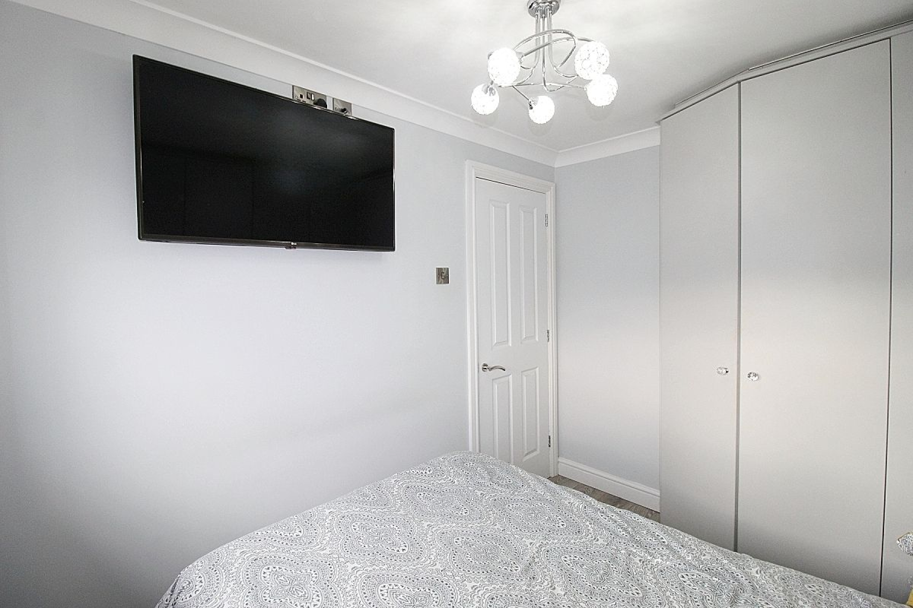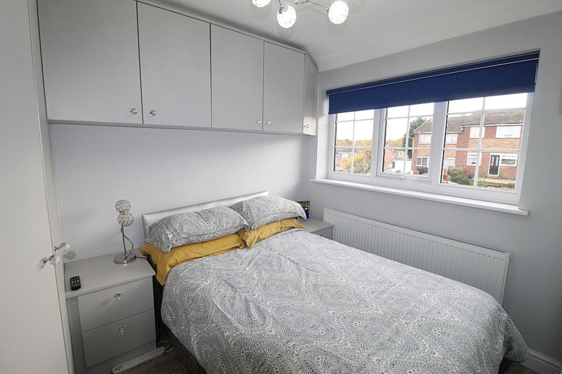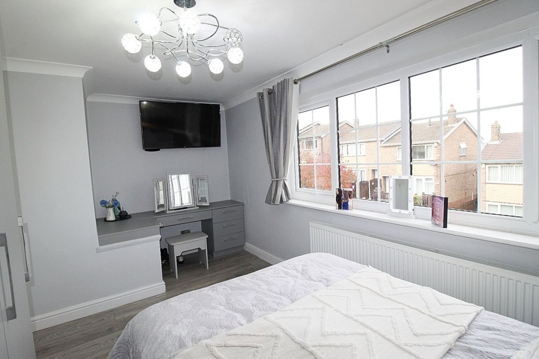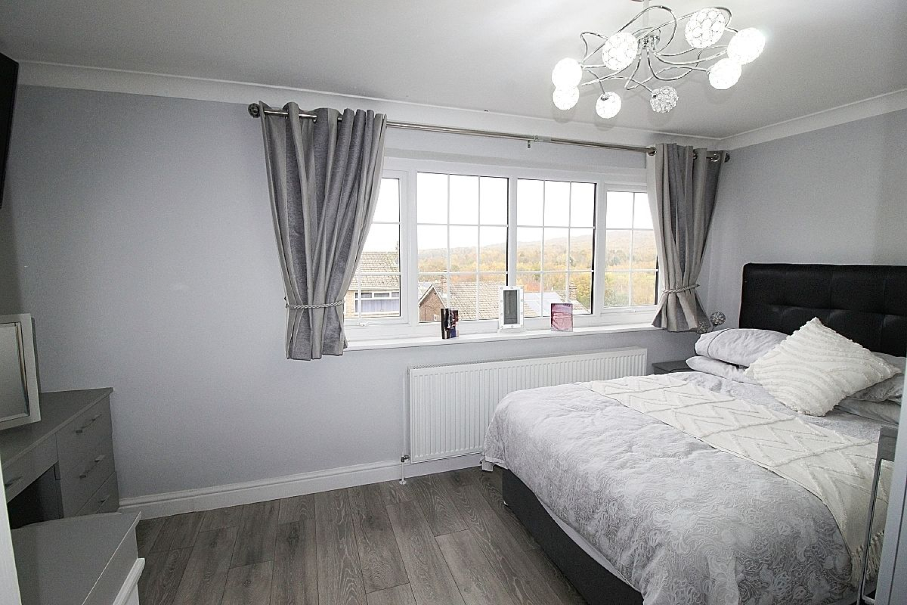 A spacious master bedroom with a large range of fitted wardrobes and furniture, Laminate flooring, radiator and a front facing upvc window.