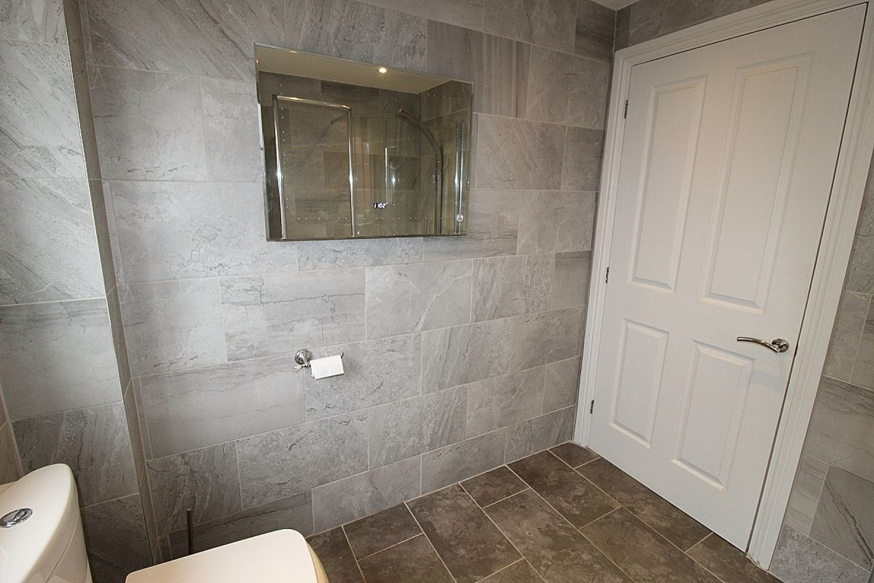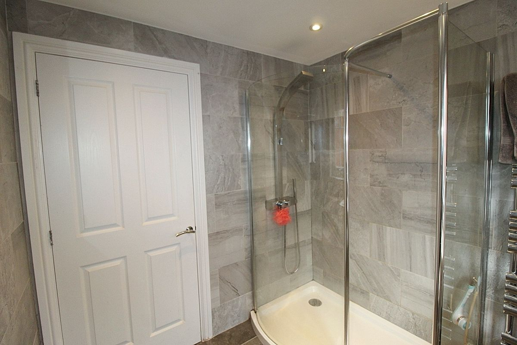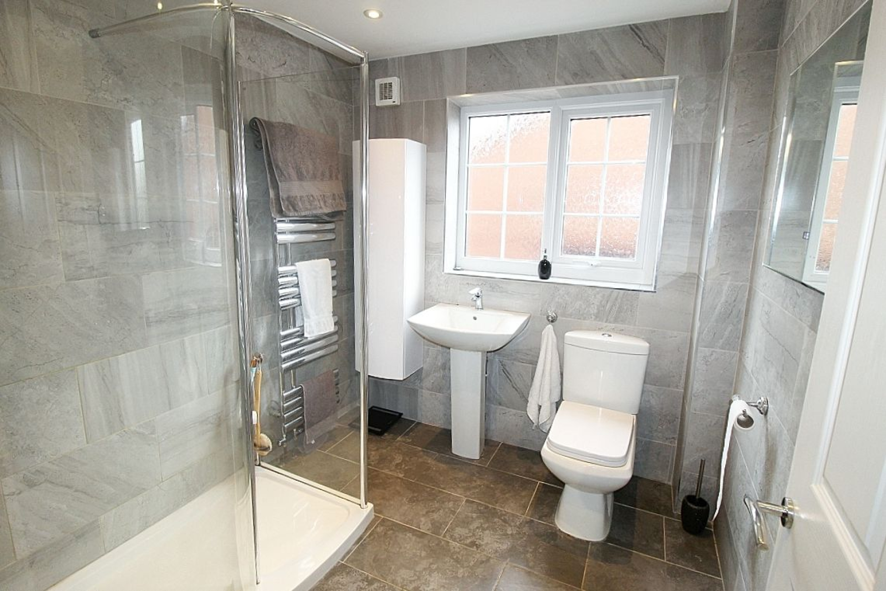 A stylish modern family shower room comprising of a walk in shower and screen, wash hand basin, a low level wc and complimentary wall mounted storage. Beautiful tiled walls with complimentary tiled flooring, designer heated towel rail, spot lighting and a side facing upvc window.