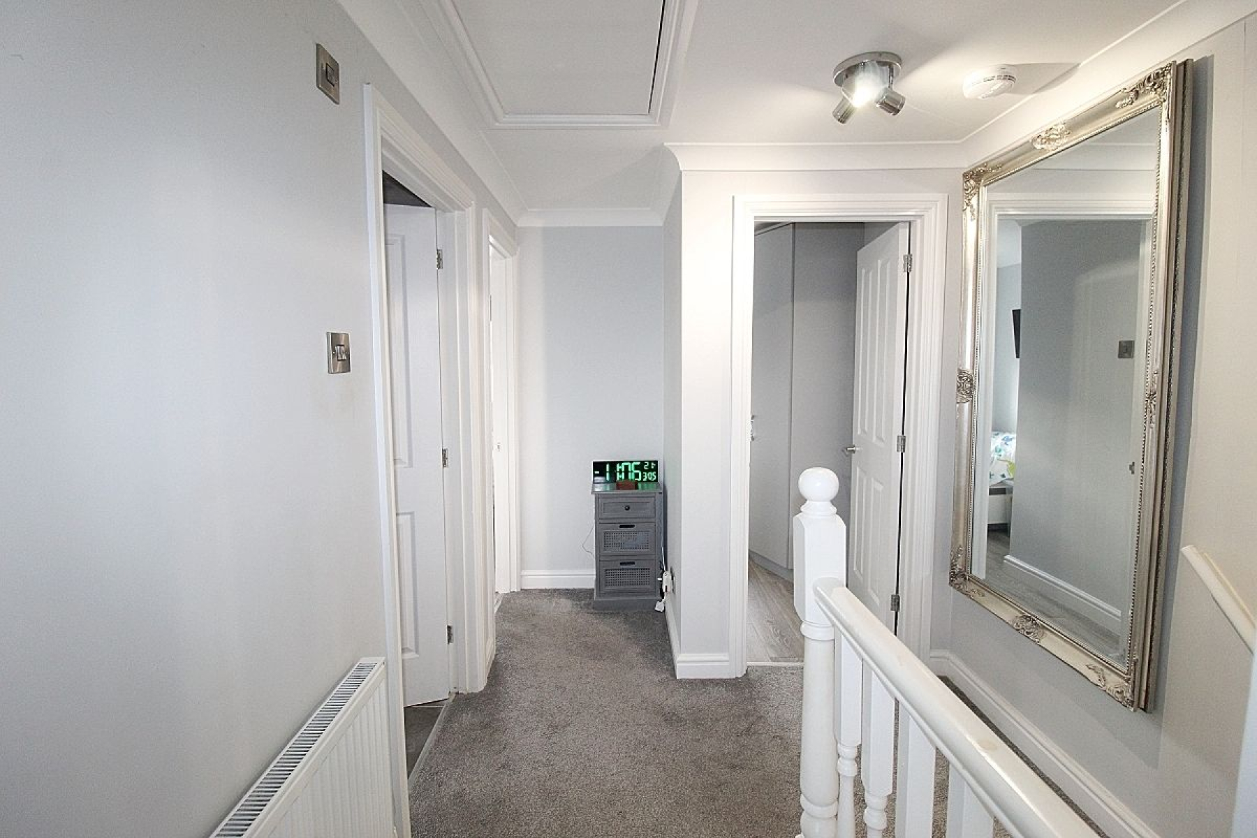 A carpeted landing with doors giving access to three bedrooms, family shower room and a loft hatch with ladder to a partially boarded loft space.