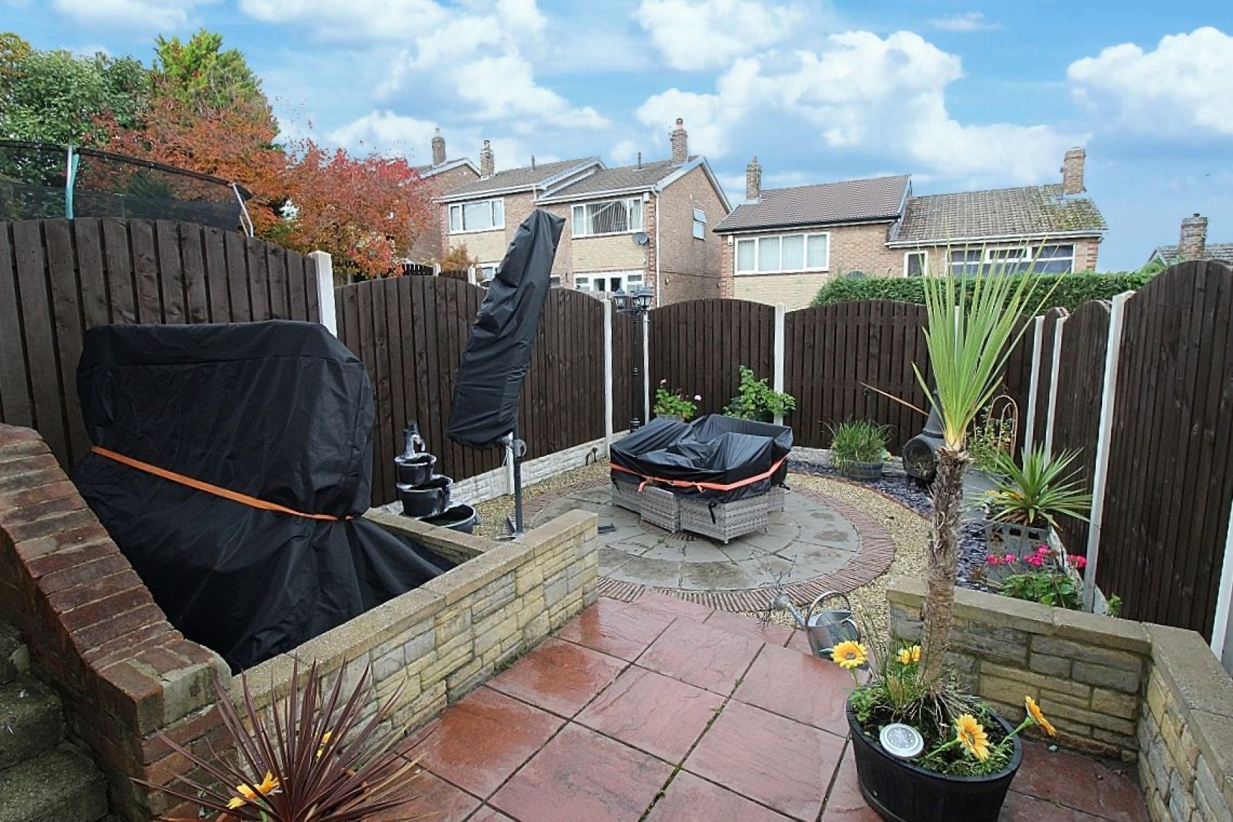 The property commands a fabulous plot with stunning landscaped gardens .A beautiful bespoke central feature with wrap around decorative stone leads to an elevated sun terrace. To the rear a large block paved driveway leading to a detached garage and a stylish Indian stone patio area.