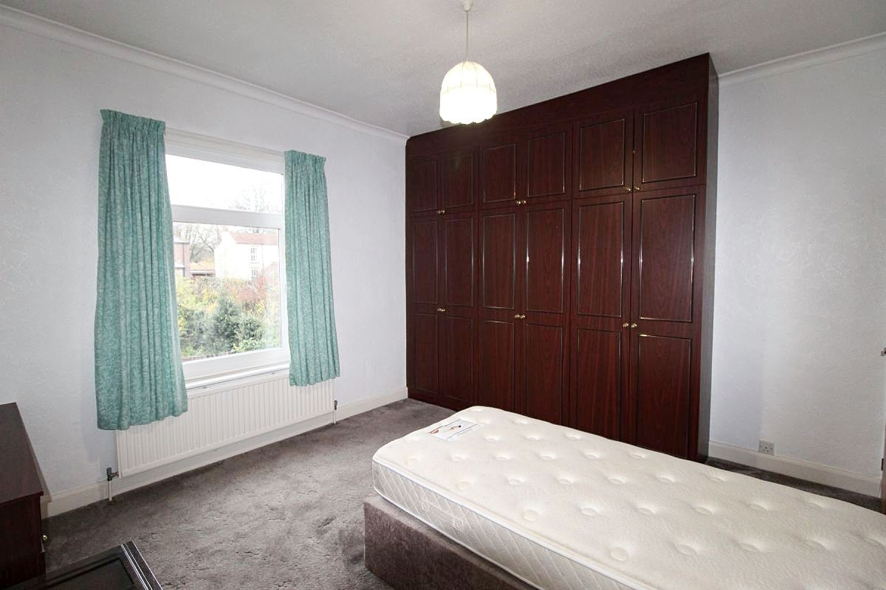A second spacious bedroom with rear-facing window, fitted wardrobes, chest of drawers and radiator. Finished with carpeted flooring and high ceilings.