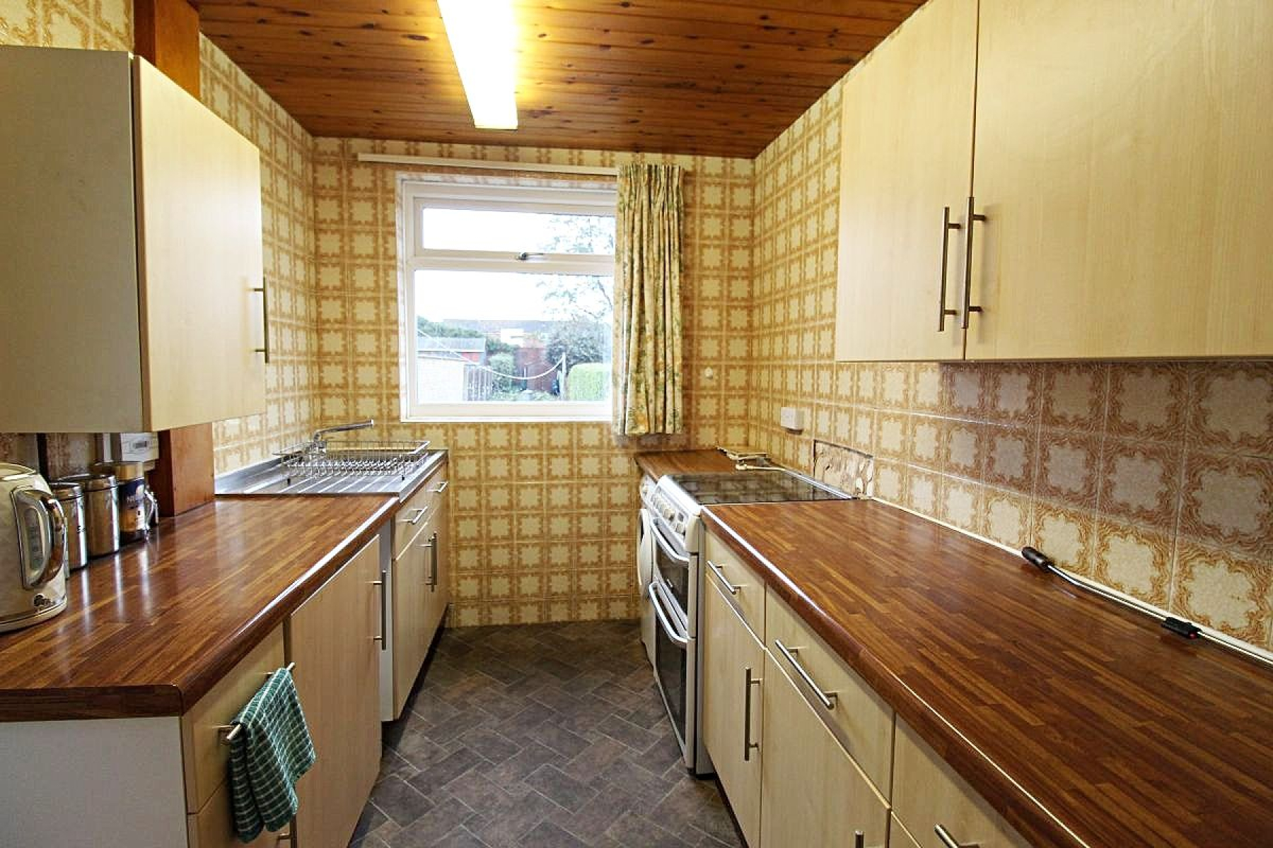 Fitted with a range of wall and base units, freestanding cooker, fridge/freezer and washing machine. Finished with worktops, tiled splashbacks, vinyl flooring and a wood-cladded ceiling. A rear-facing window overlooks the garden and a door leads directly outside.