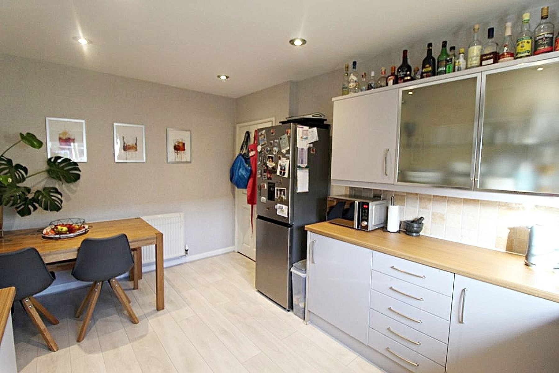 Modern fitted wall and base units with worktops and tiled backsplash. Integrated electric oven, electric hob with extractor, dishwasher and fridge, with additional space for appliances. Laminate flooring, radiator, spotlights and a front-facing window. Ample space for a family dining table.