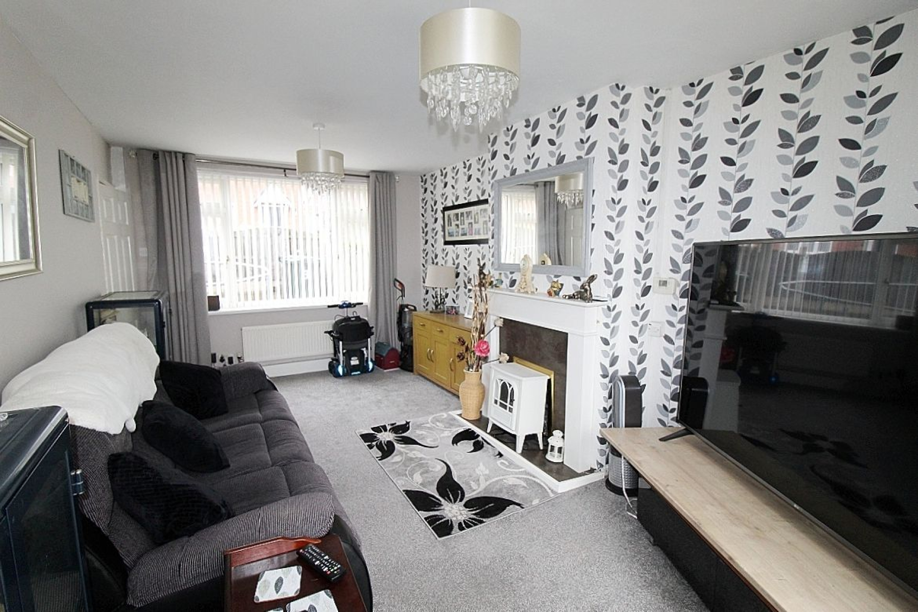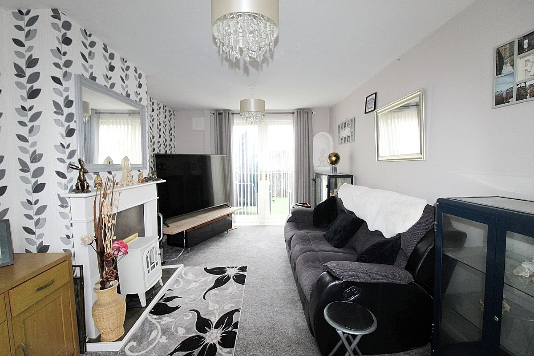 A bright and inviting room with a beautiful feature wall adopting a further decorative fire place, carpeted flooring, front facing upvc window, radiator and French doors opening onto the patio area.