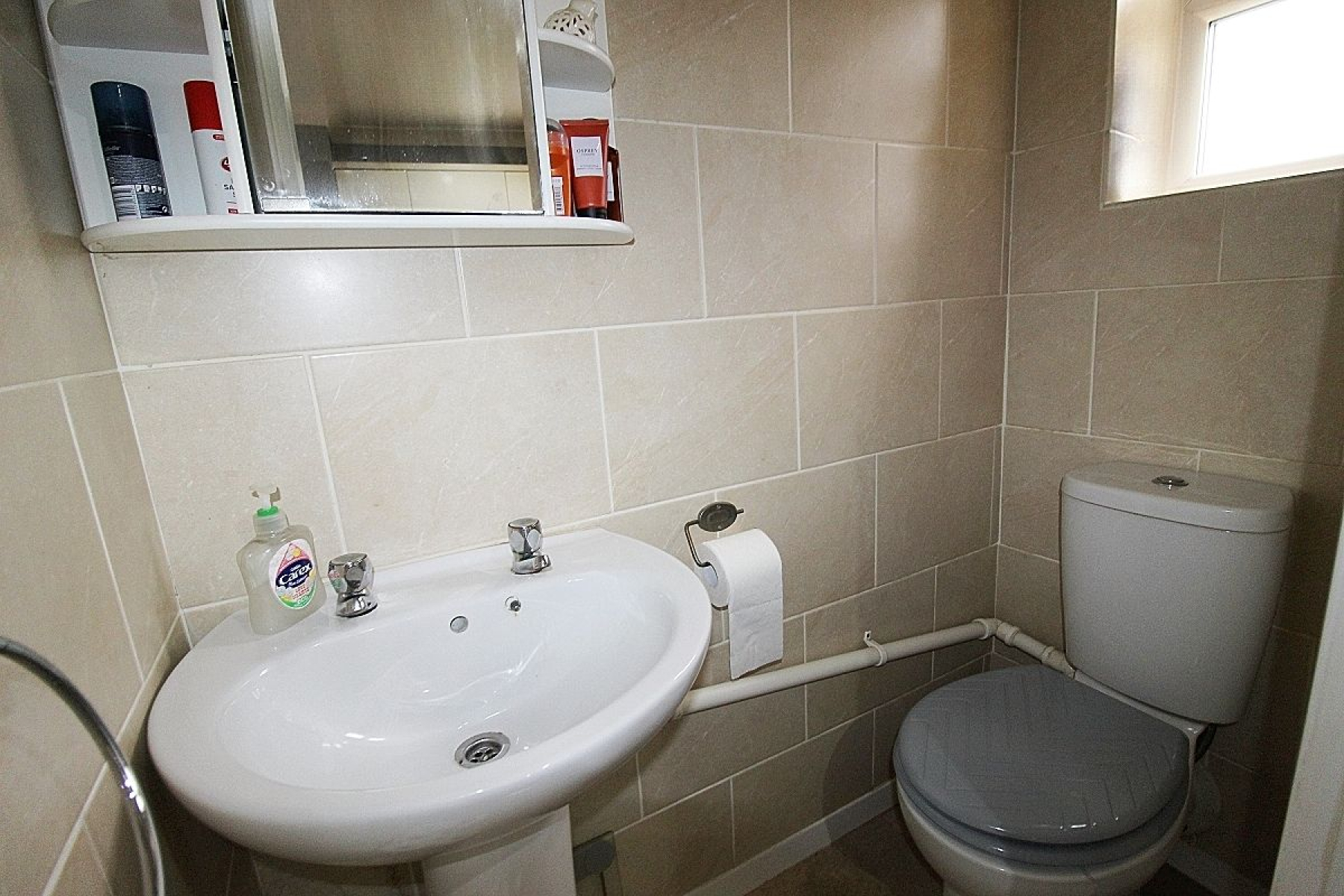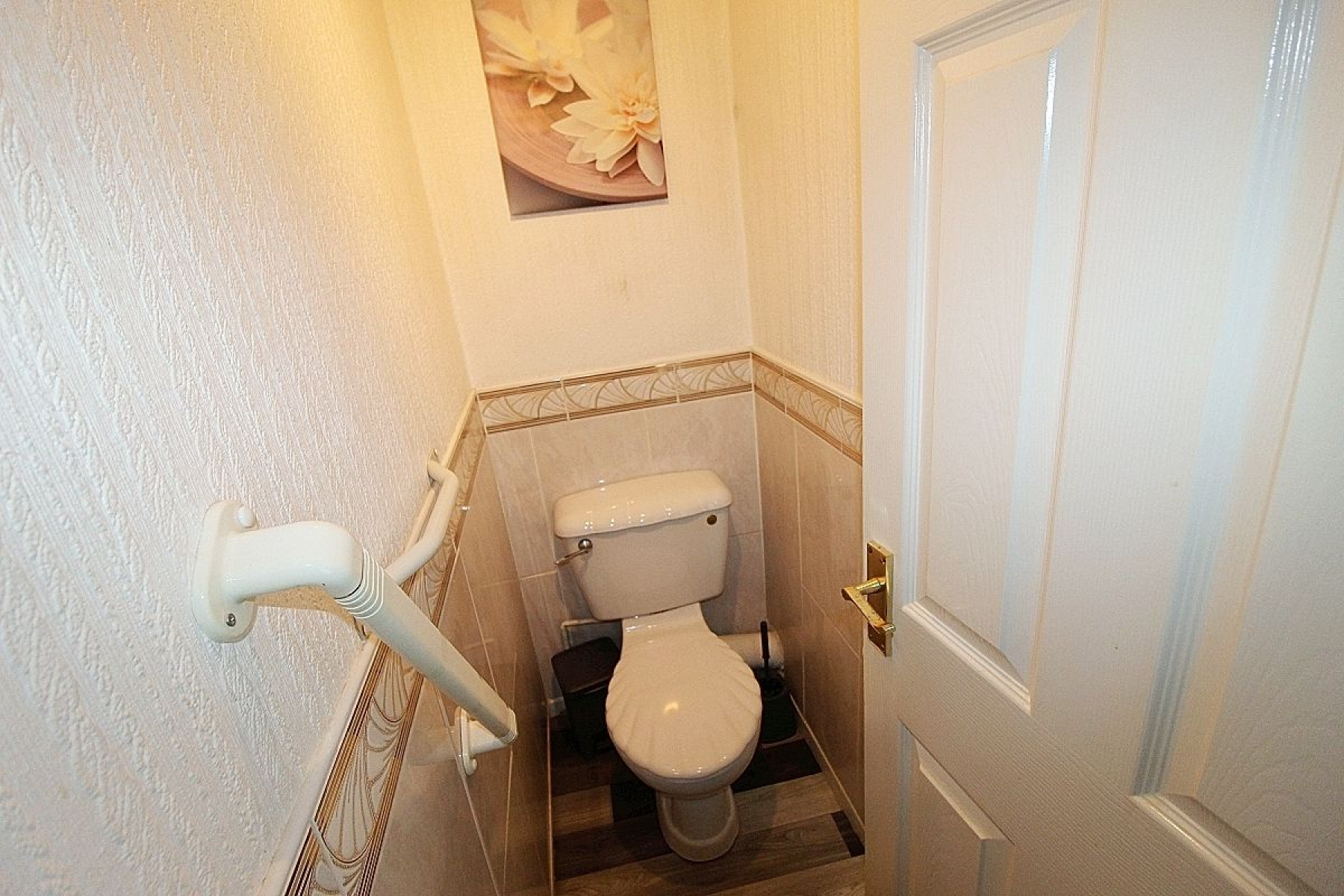 A modern separate wc with partially tiled walls, vinyl flooring and a rear facing upvc window.