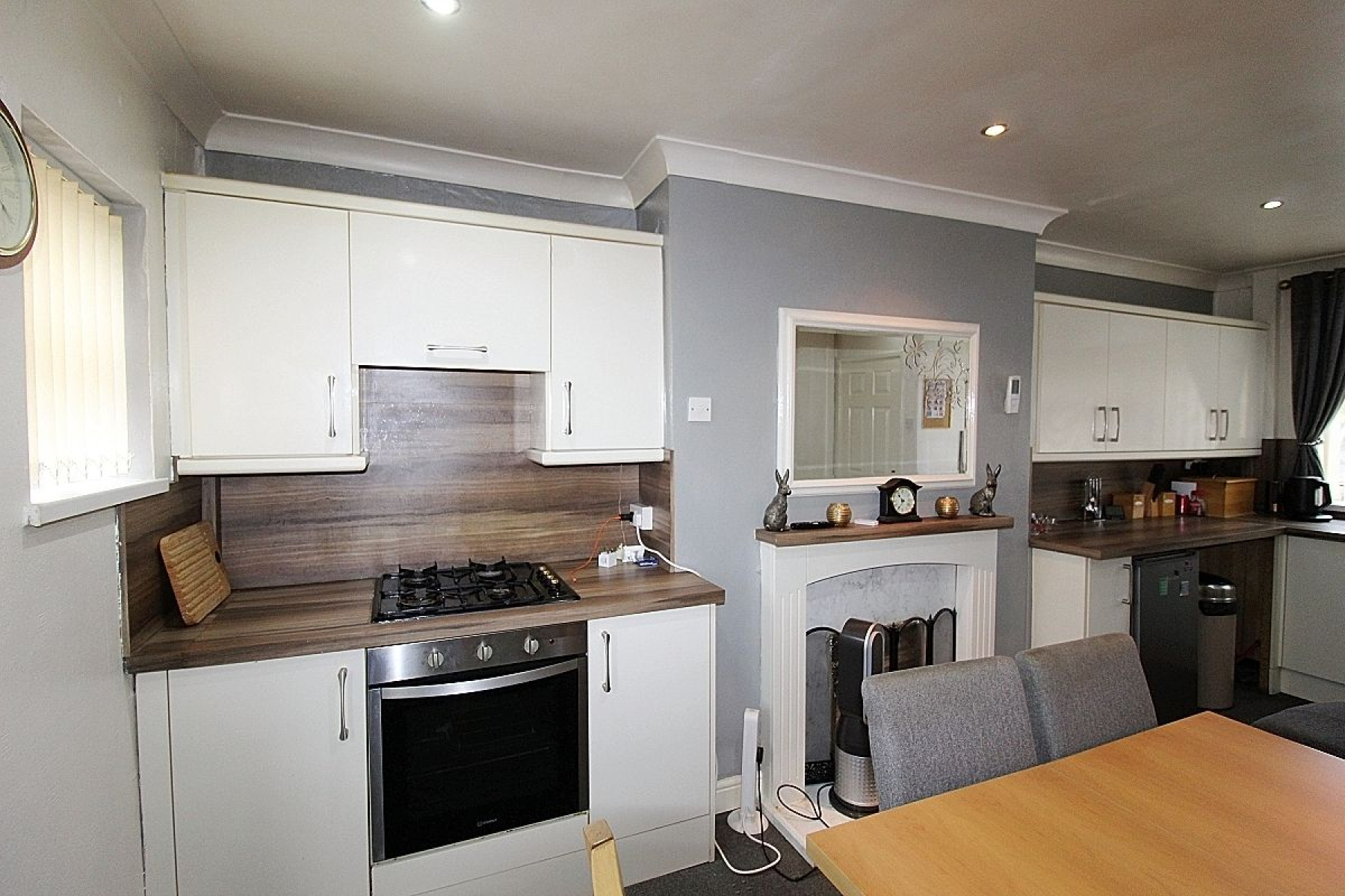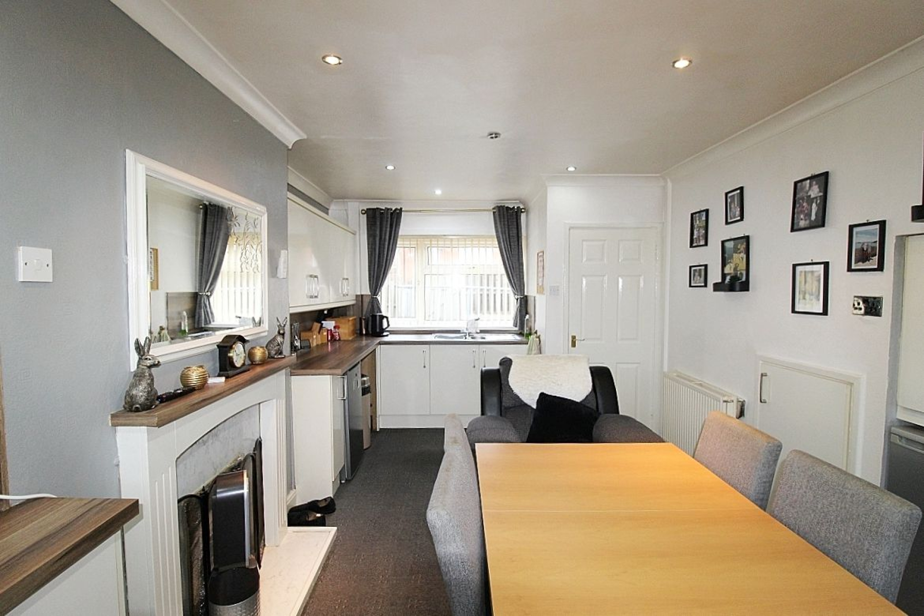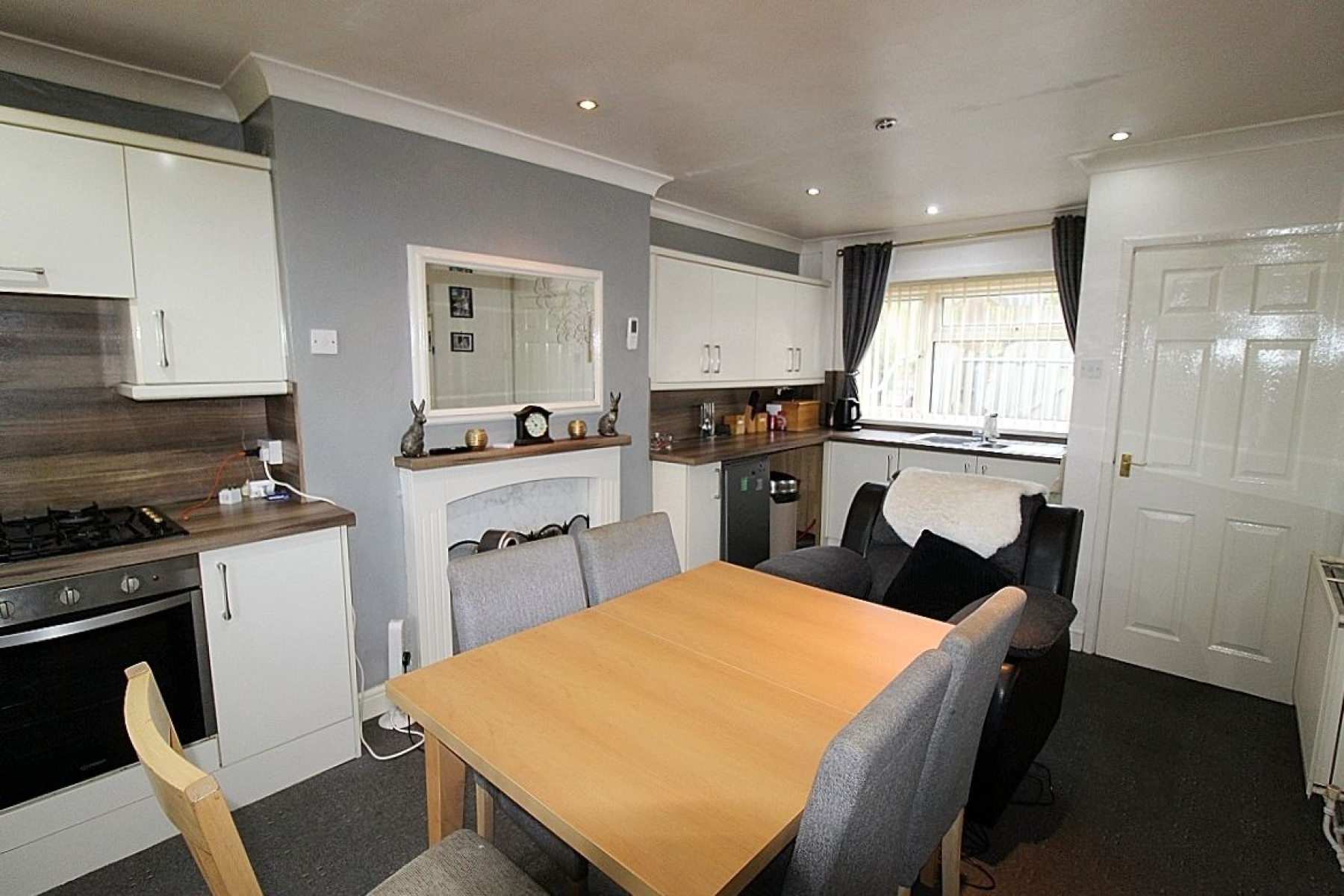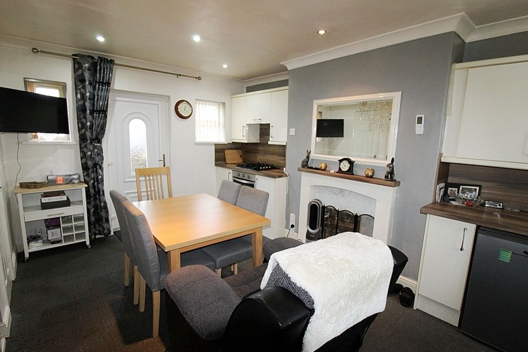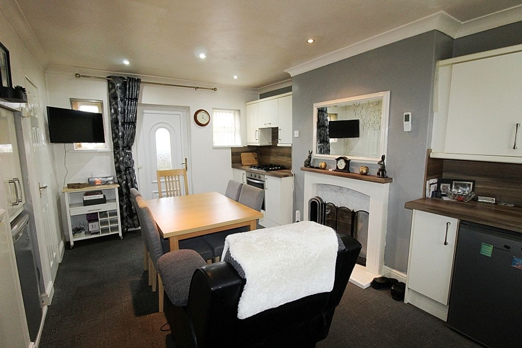 A modern kitchen fitted with a range of base and wall units complemented by worktops, matching back panels and a decorative fire place creates a feature. Appliances to include an inset oven with gas hob, extractor and plumbing for further utilities. Carpeted flooring seamlessly flows throughout, under stairs storage, radiator, rear and front facing upvc windows add an abundance of light along with a glazed upvc door to the rear and spot lighting creates the mood.