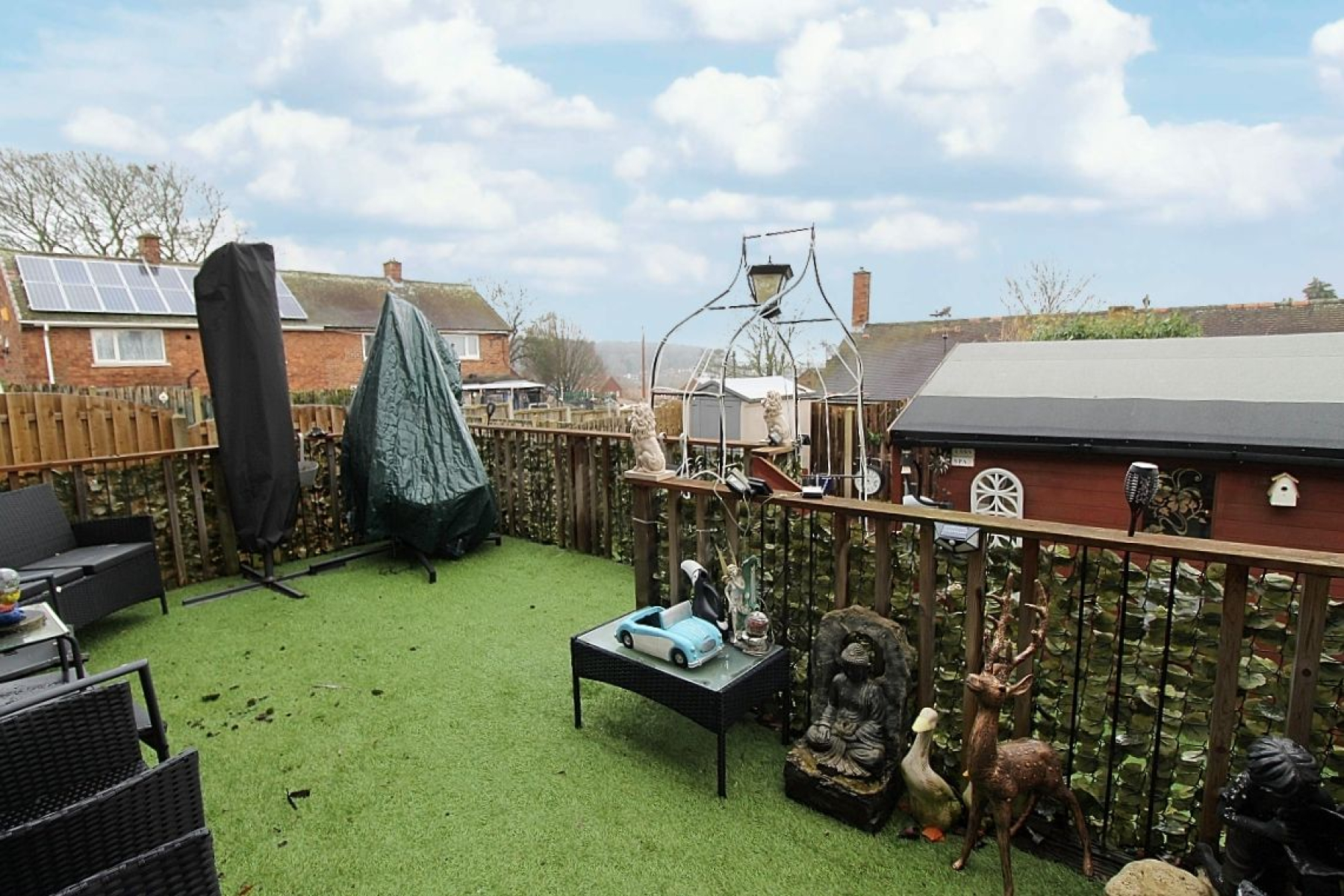 A gated low maintenance frontage with Astro turf garden. Further gated access to a stunning landscaped rear garden where a raised Astro turf sun terrace with balustrades leads to a further Asto turf garden, this in turn leads to a block paved patio with garden shed. A fabulous bespoke summer house adds to the attraction creating a versatile outdoor space ideal for summer entertaining, family gatherings, or simply relaxing in the sun.
