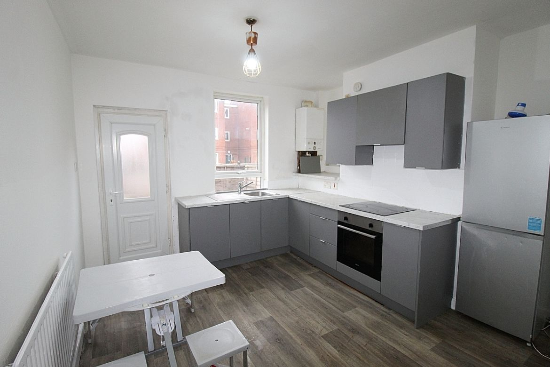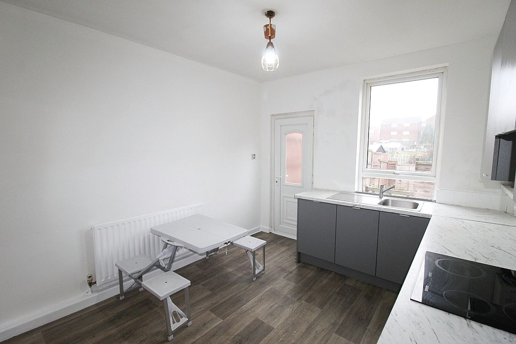 Kitchen w: 3.6m x l: 3.7m (w: 11' 10" x l: 12' 2") Comprising of a range of wall and base units with contrasting worksurface areas and tiled splash backs. Features include a built in oven, electric hob with extractor above, plumbing for utilities and a rear facing upvc window along with a glazed upvc door overlooking the garden, a continuation of the vinyl flooring and radiator.