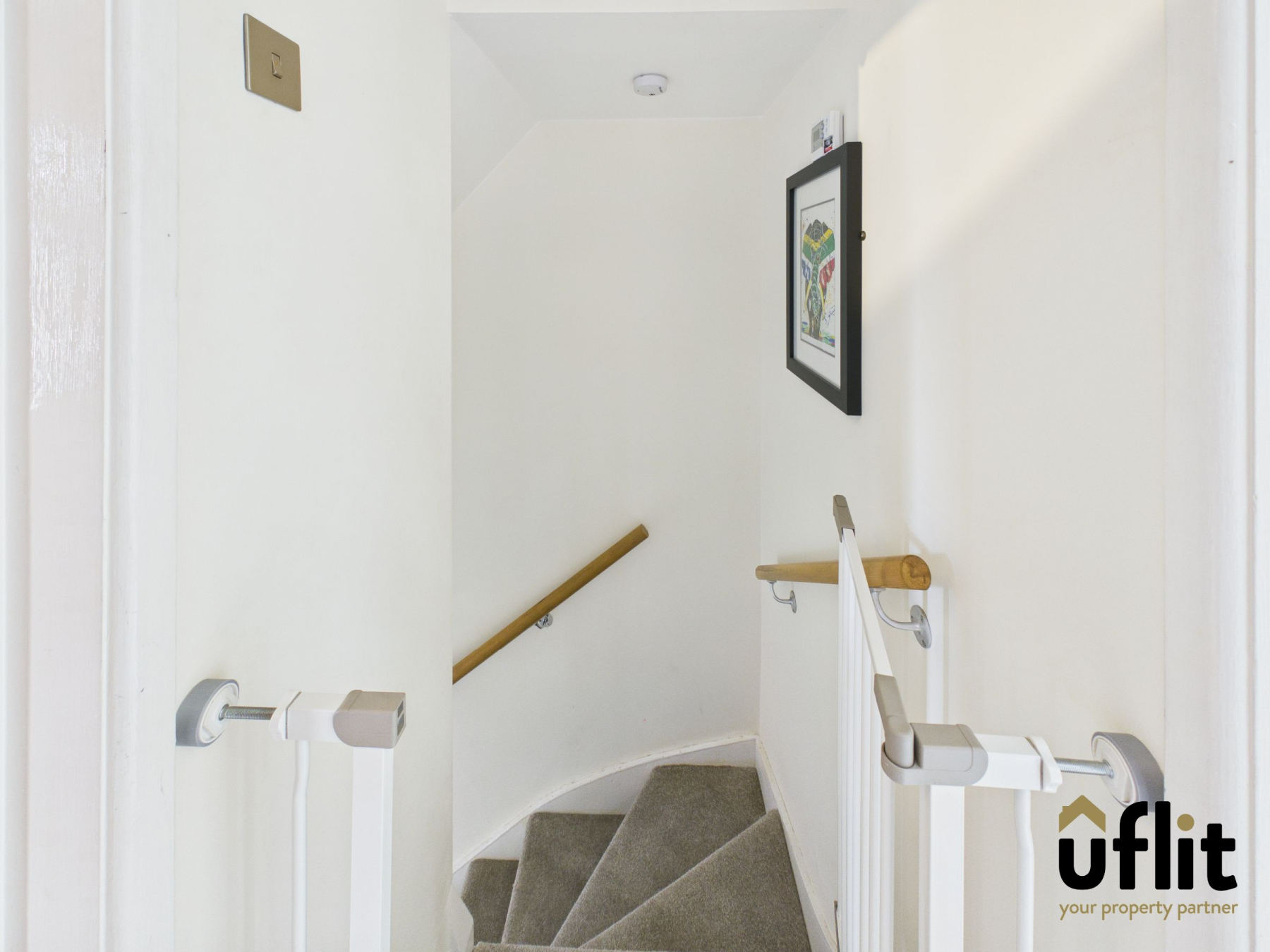 The carpeted landing provides access to both bedrooms and the family bathroom. There is a loft hatch for additional storage, with carpeted stairs leading up from the dining area.