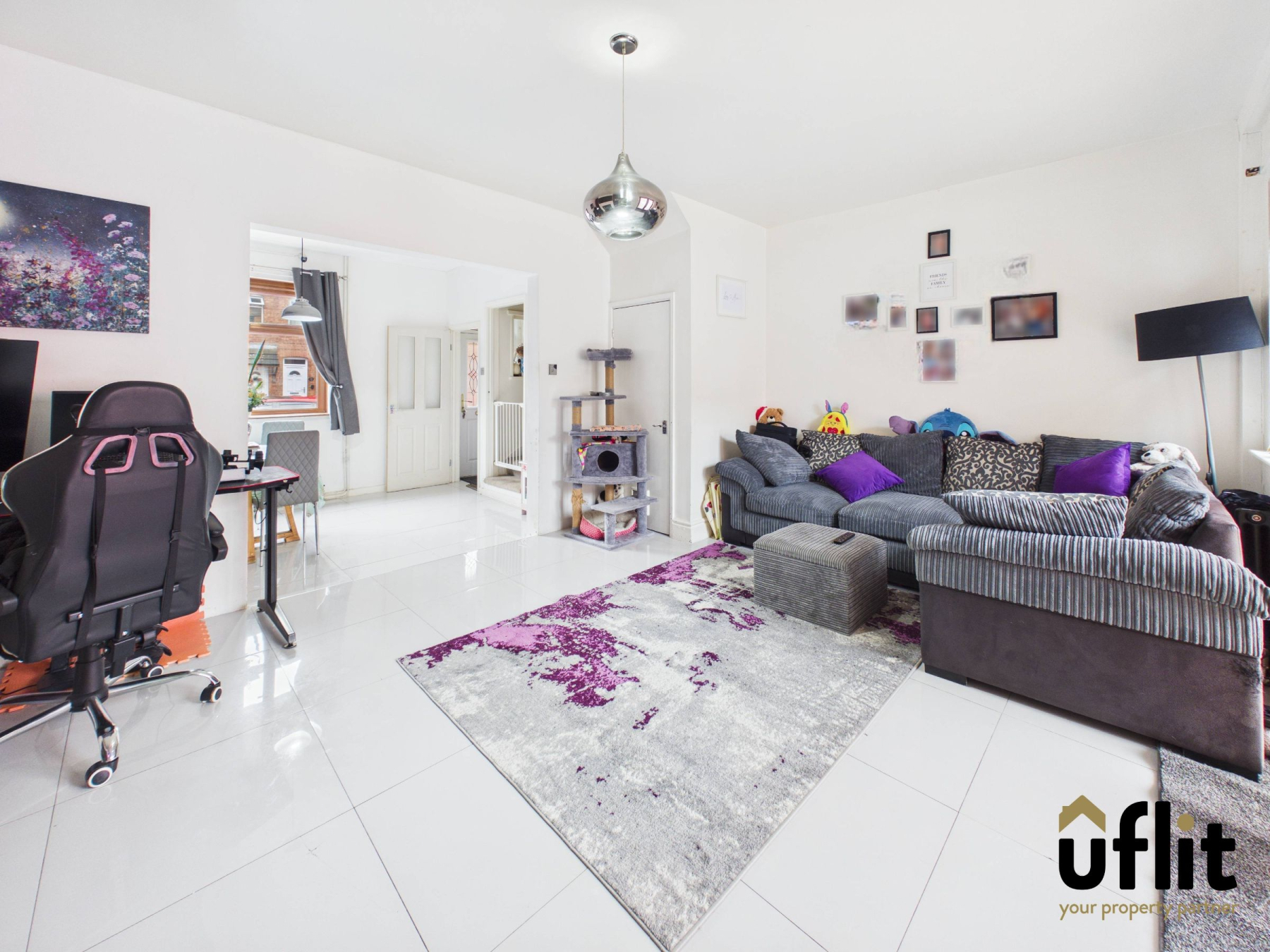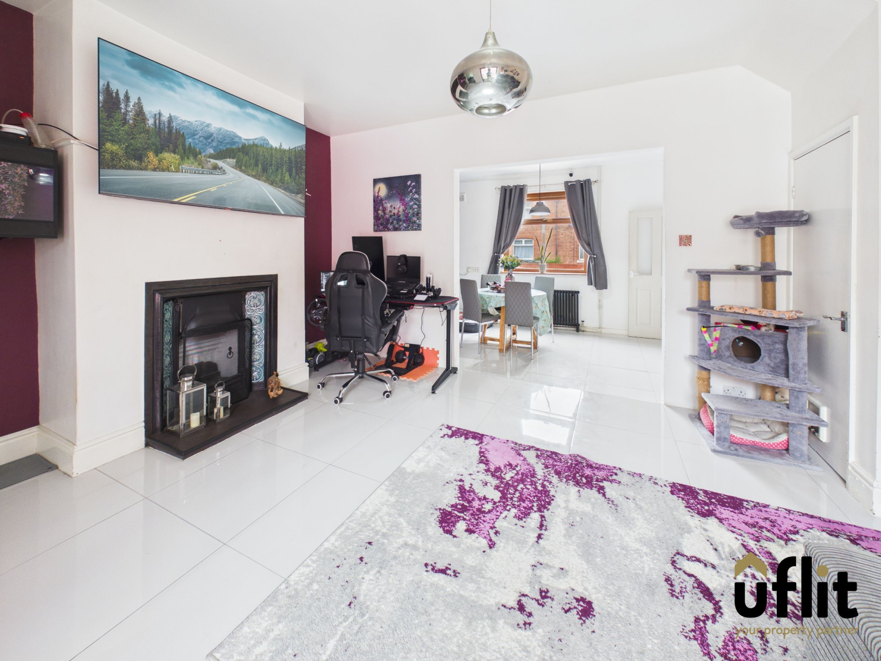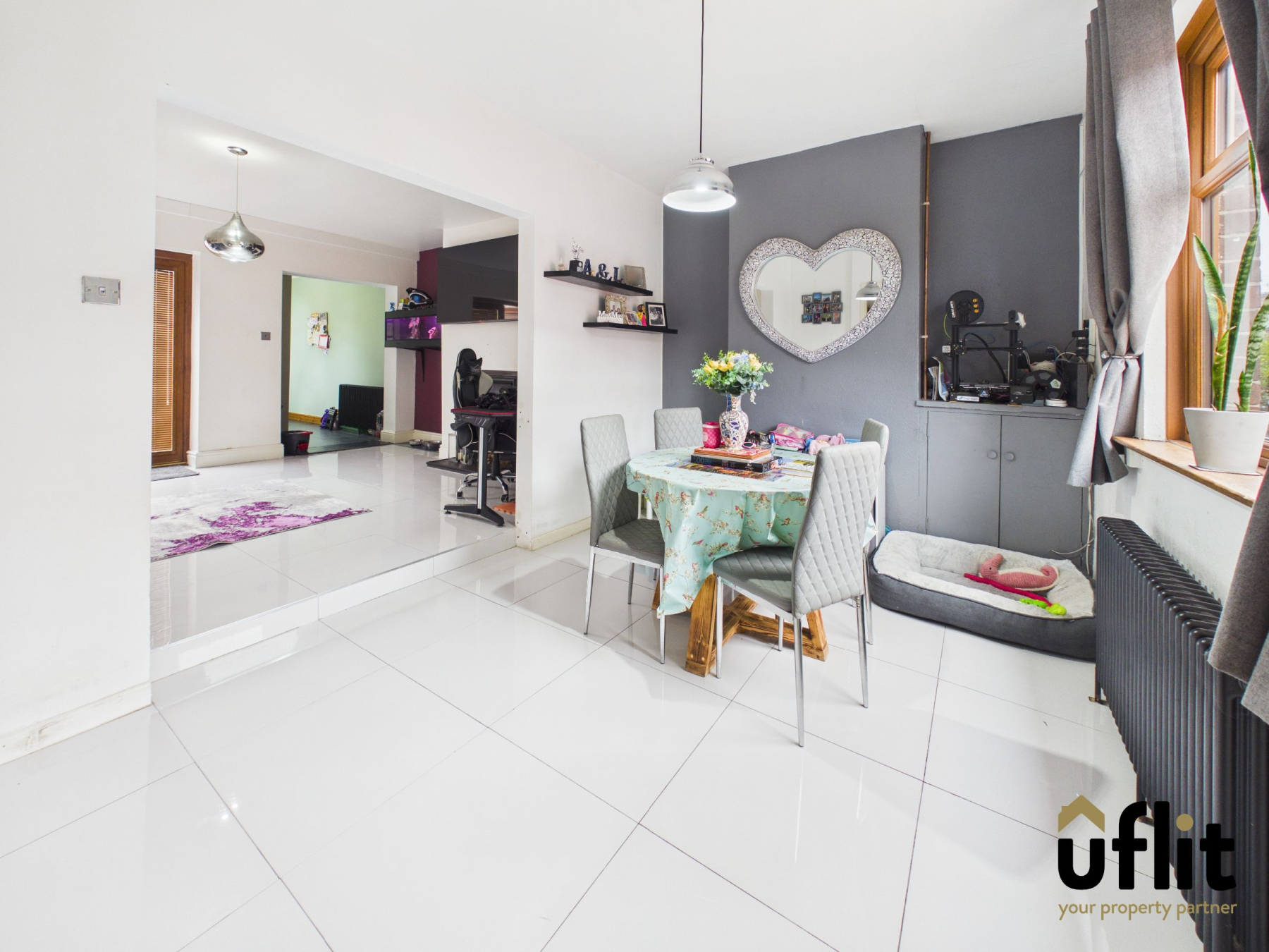 Entered directly from the porch, this open-plan dining space features tiled flooring and a front-facing window that fills the room with natural light. A radiator provides heating and an archway leads seamlessly into the lounge. The staircase to the first floor is accessed from this space, maintaining an open and connected layout.