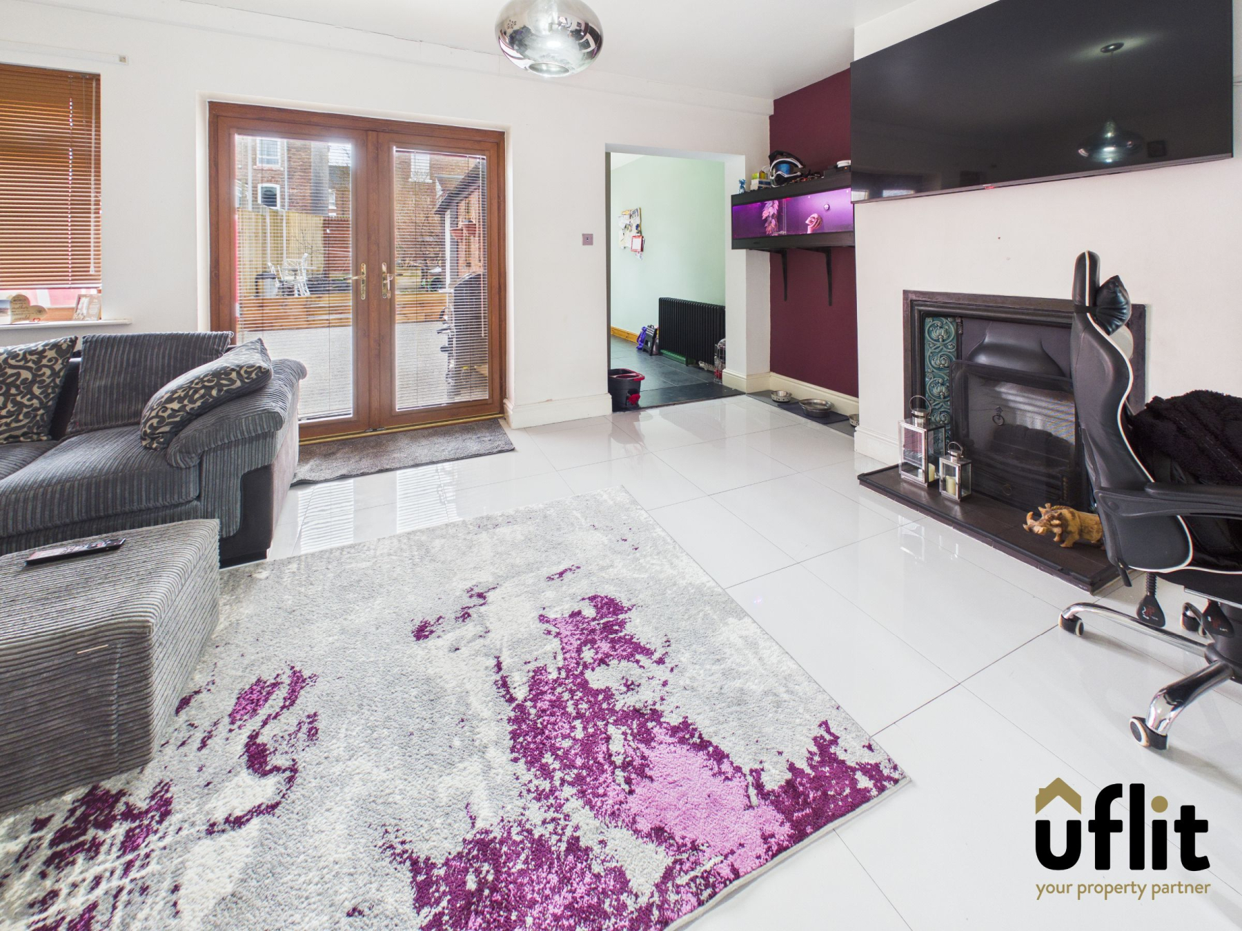 The lounge is positioned to the rear of the property and benefits from tiled flooring throughout. A feature fireplace with original tiled detailing provides a charming focal point. French doors open directly onto the rear garden, with an additional rear window ensuring the room is light and airy. A storage cupboard adds practical space and a radiator provides additional warmth.
