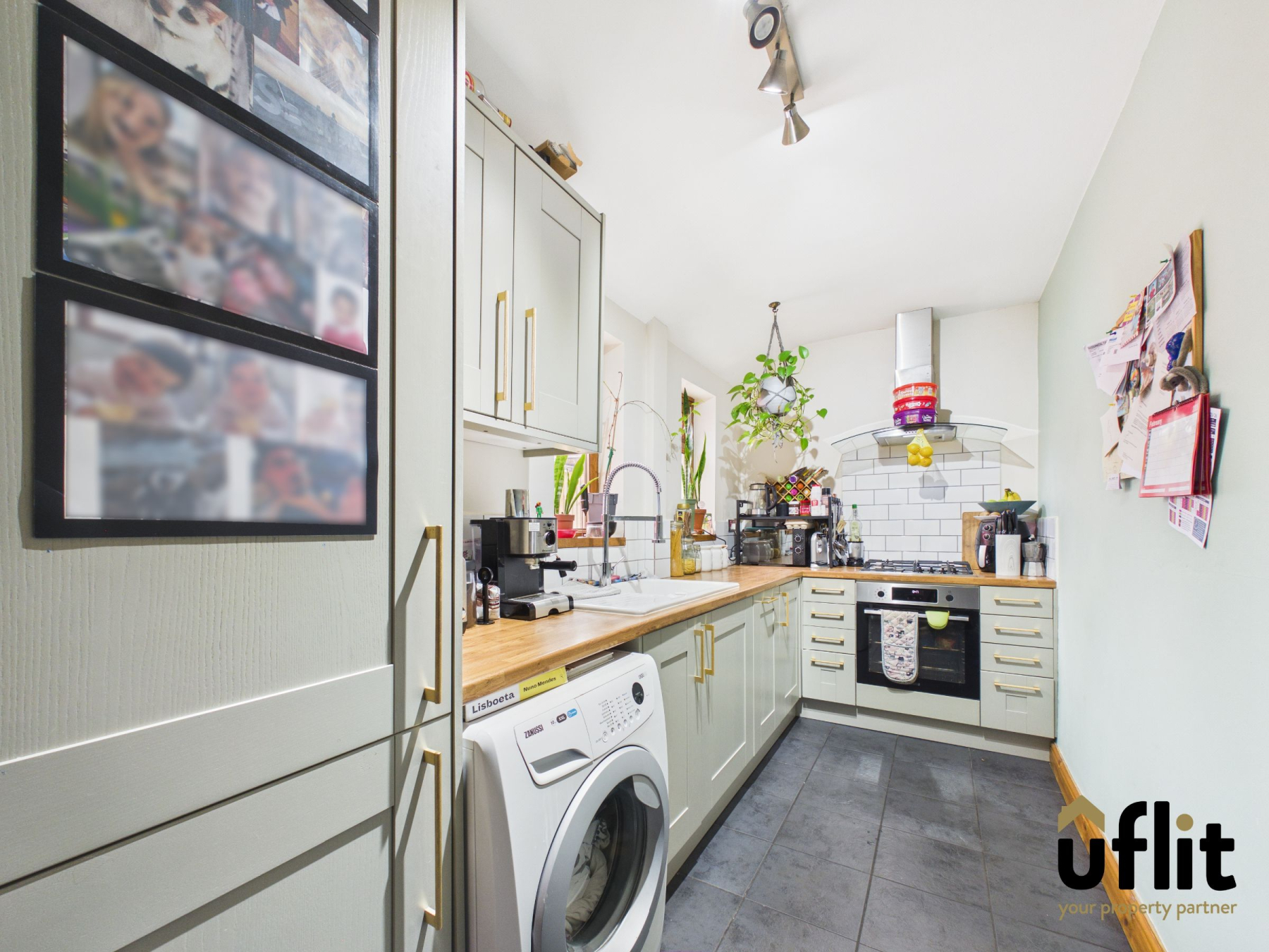 The extended kitchen is fitted with tiled flooring for easy maintenance. It includes integrated appliances such as a fridge freezer, dishwasher, electric oven, gas hob, and extractor fan with lighting, alongside space for a washing machine. Two rear-facing windows allow plenty of natural light and the walls are partially tiled for a clean and practical finish.