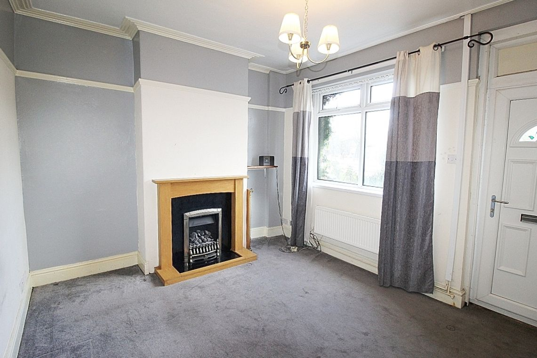 Living room w: 3.9m x l: 3.4m (w: 12' 10" x l: 11' 2") Entering through a glazed upvc door to a spacious living area with a decorative fire place. Carpet seamlessly flows throughout whilst a radiator adds warmth, a front facing upvc window adds to the light and a door opens to carpeted stairs and a further door to the breakfast kitchen.