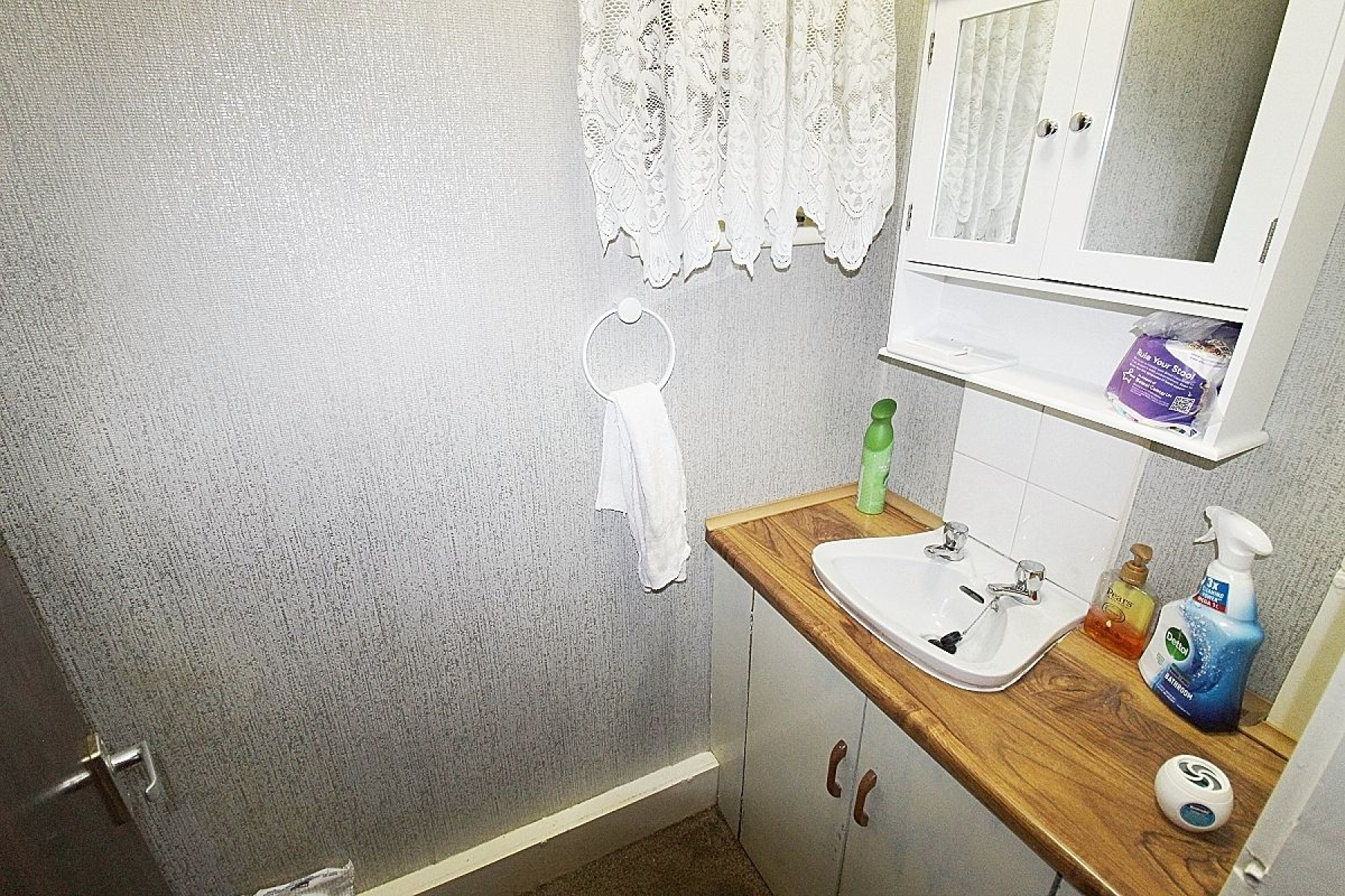 Comprising of a mid-level wc, vanity wash hand basin with tiled back panel and carpeted flooring.