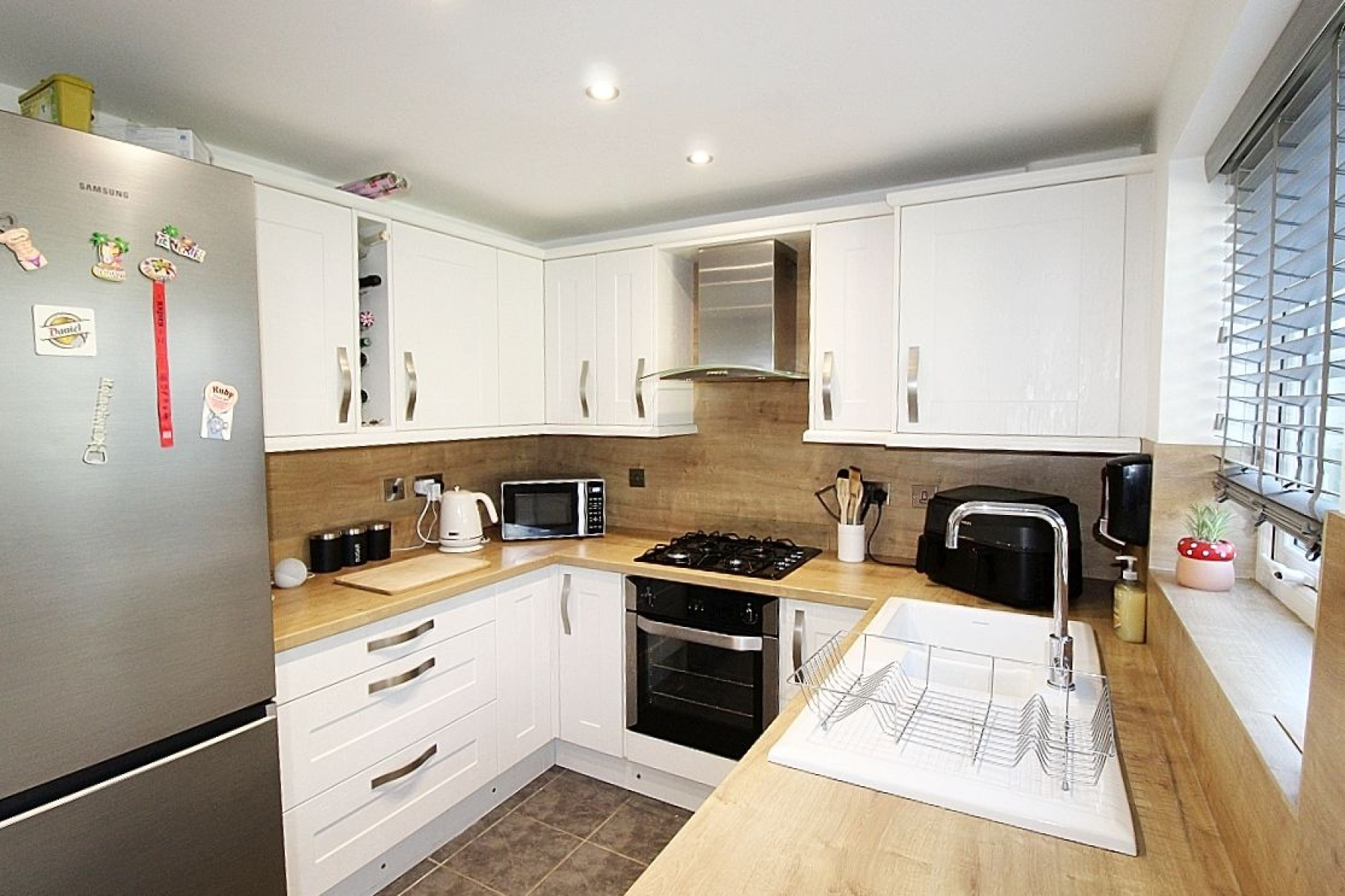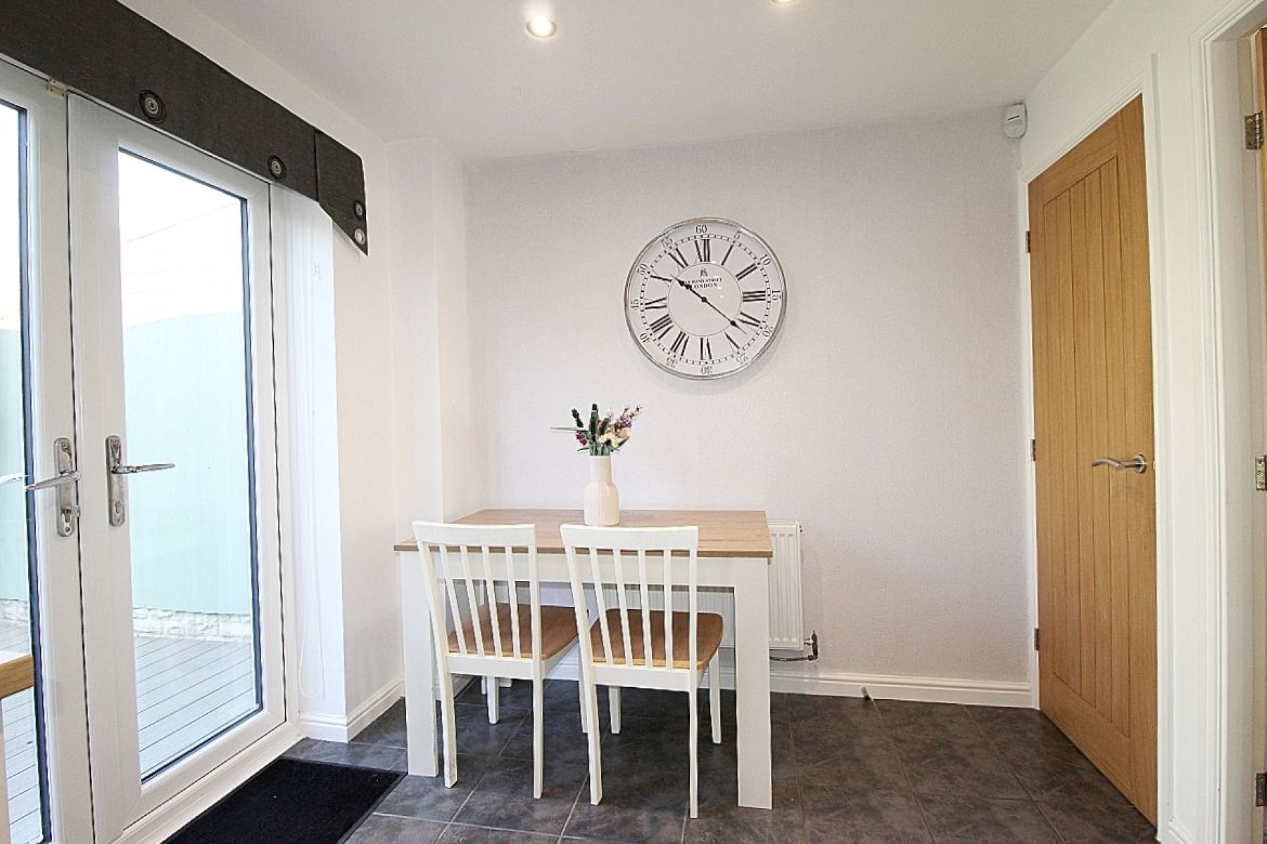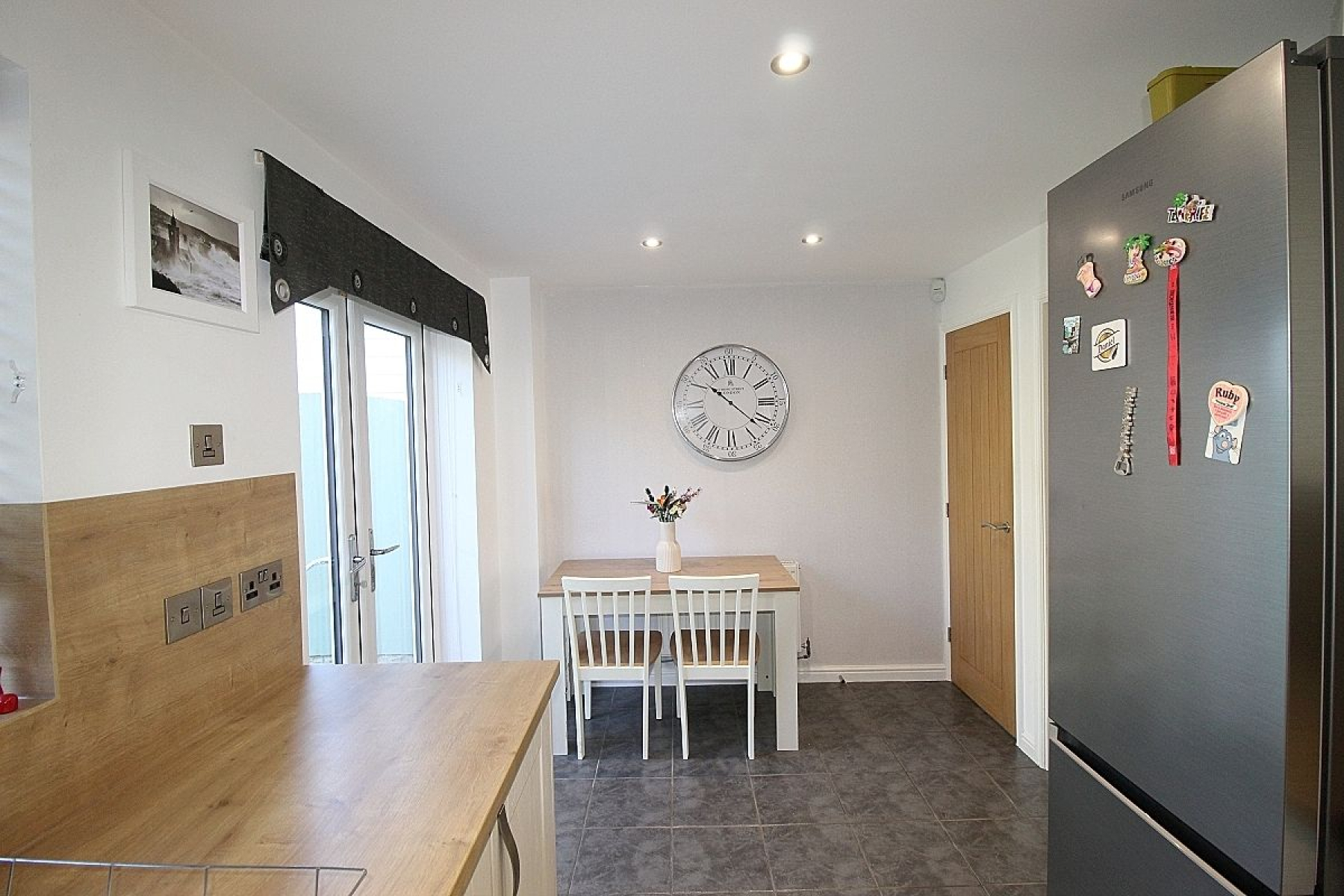 Featuring a range of wall and base units with complimentary laminate work surface areas, counter top sink and matching back panels. Appliances to include a built in electric oven, gas hob, extractor fan and an integrated dishwasher to compliment. A beautiful tiled floor leads to French upvc doors which open onto the garden and a rear facing upvc window. Spot lighting creates the mood and a solid wood door to under stairs storage.