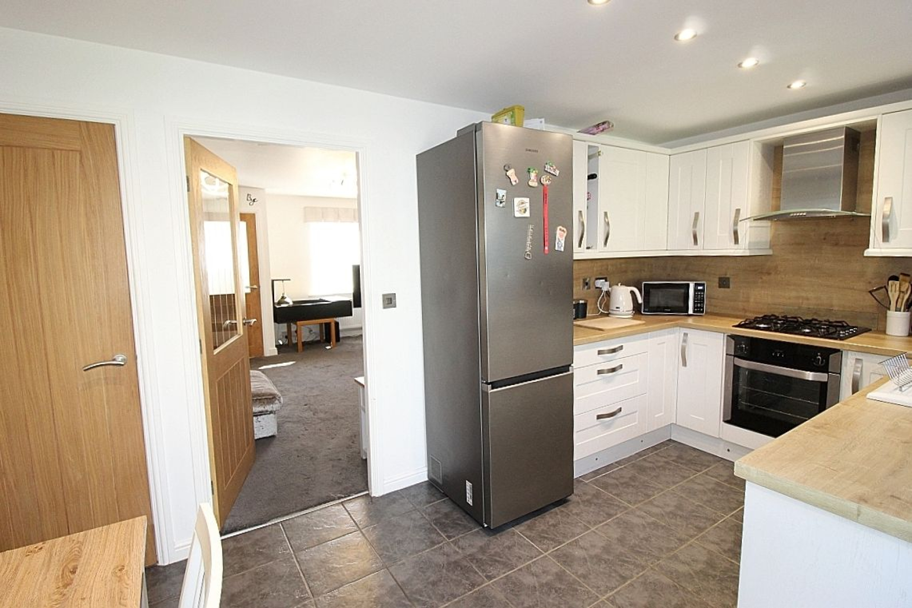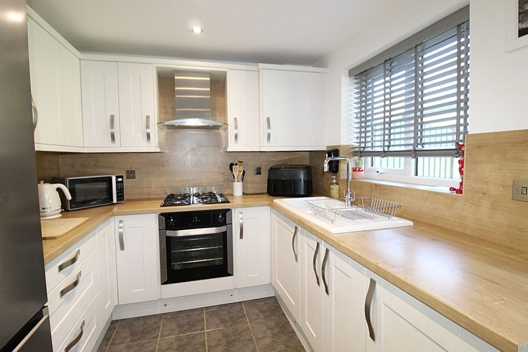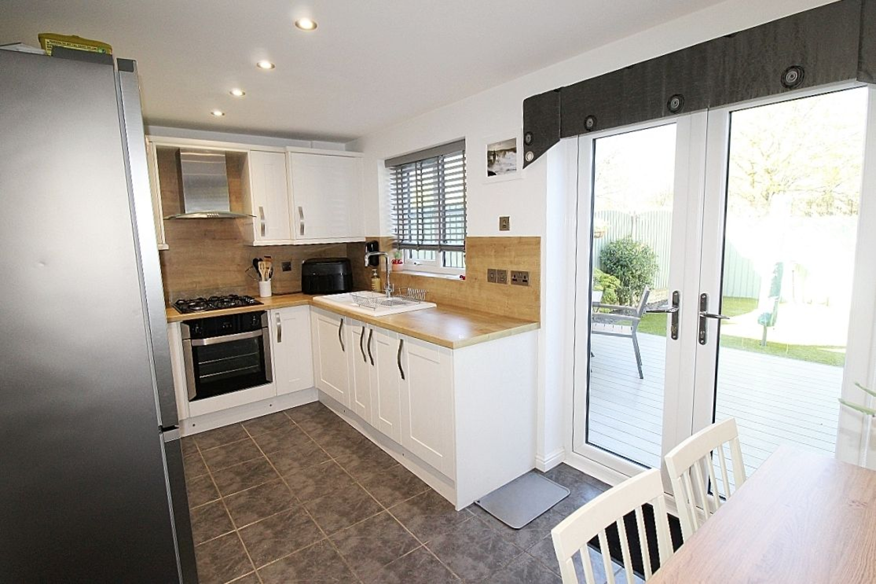 Featuring a range of wall and base units with complimentary laminate work surface areas, counter top sink and matching back panels. Appliances to include a built in electric oven, gas hob, extractor fan and an integrated dishwasher to compliment. A beautiful tiled floor leads to French upvc doors which open onto the garden and a rear facing upvc window. Spot lighting creates the mood and a solid wood door to under stairs storage.