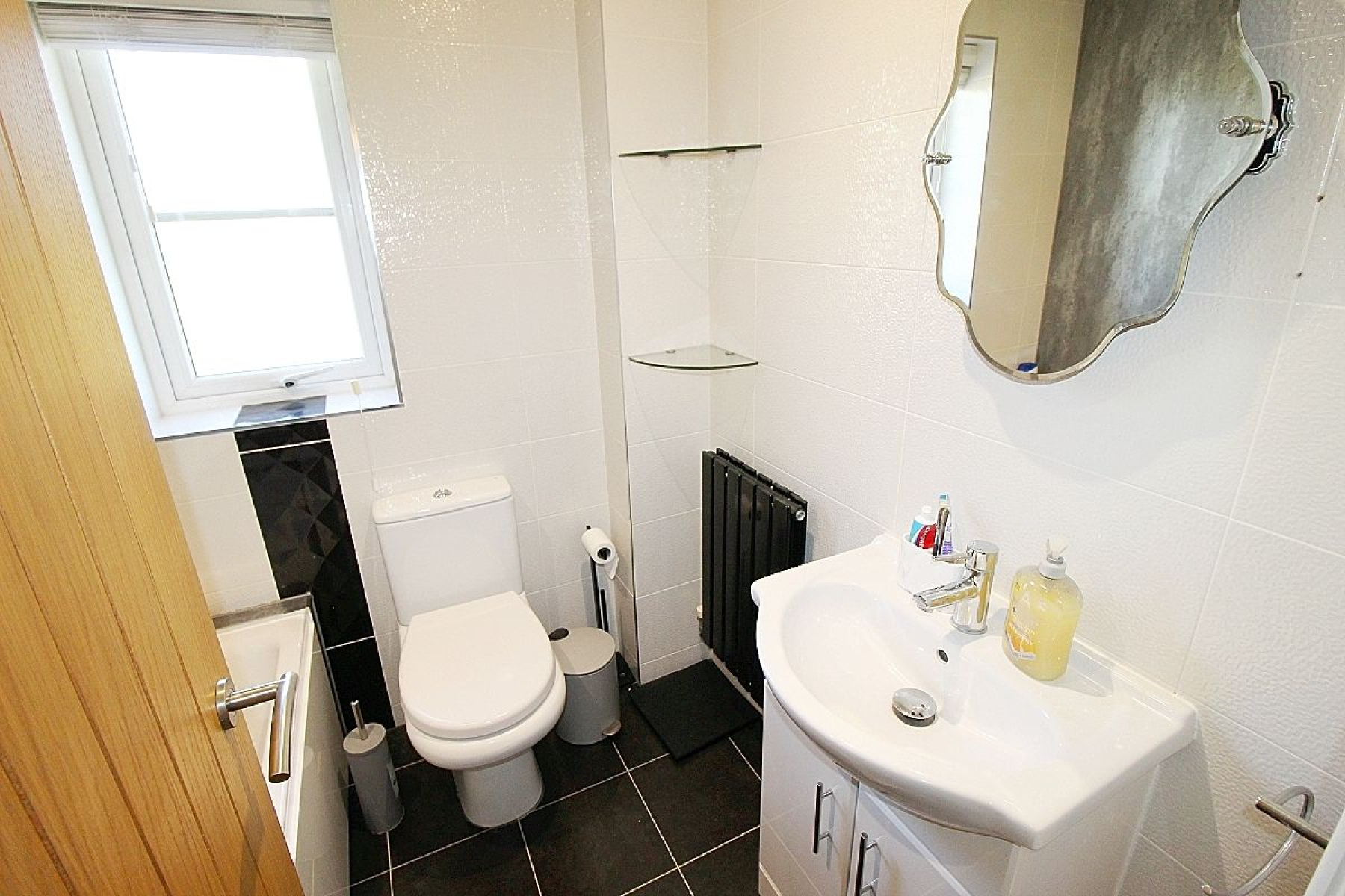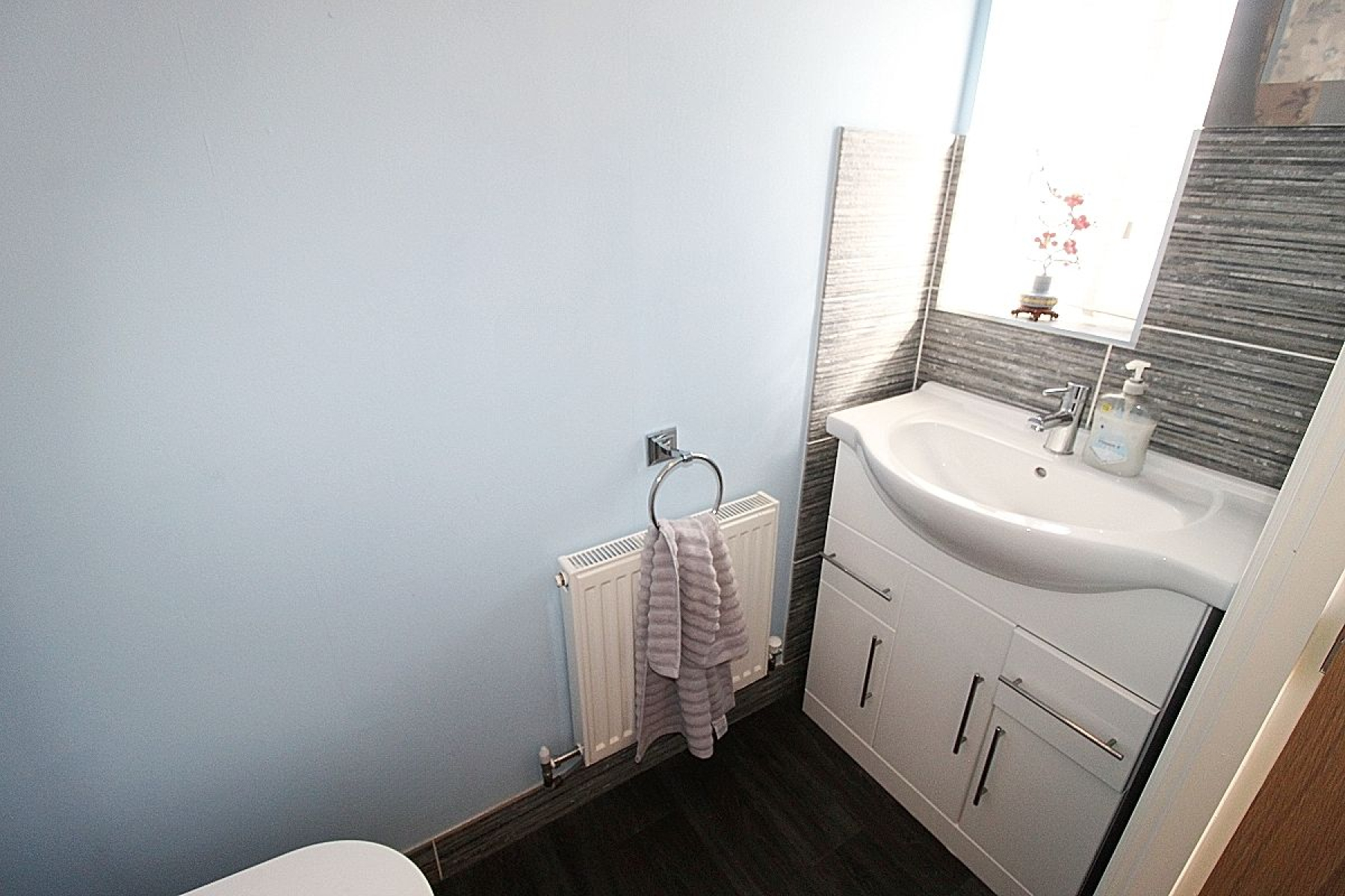 Comprising of a low level wc, vanity wash hand basin with tiled back panels, vinyl flooring, radiator and a front facing upvc window.