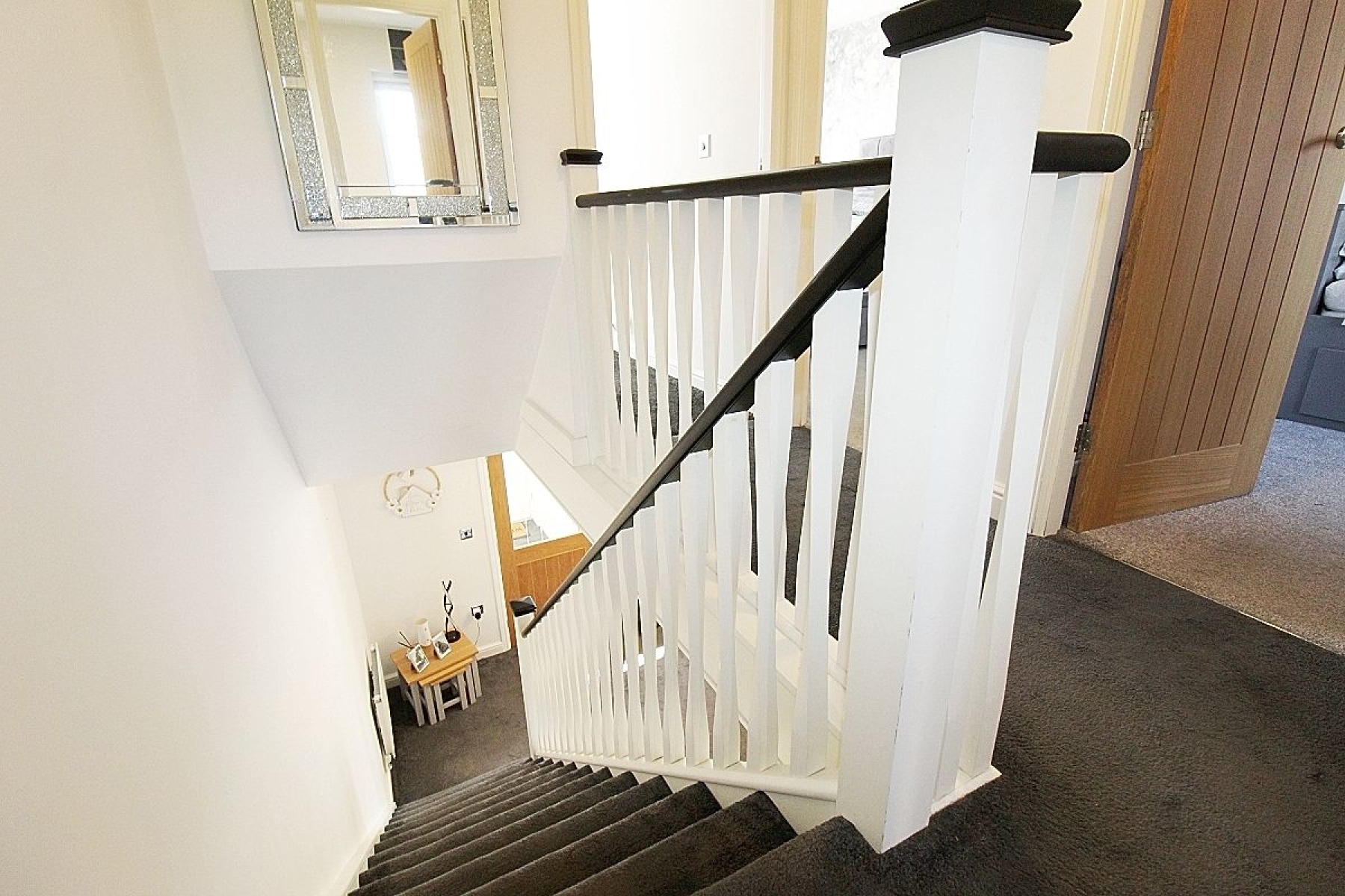 A carpeted spindled landing with loft hatch creating additional storage space and solid wood doors giving access to three bedrooms and the family bathroom.