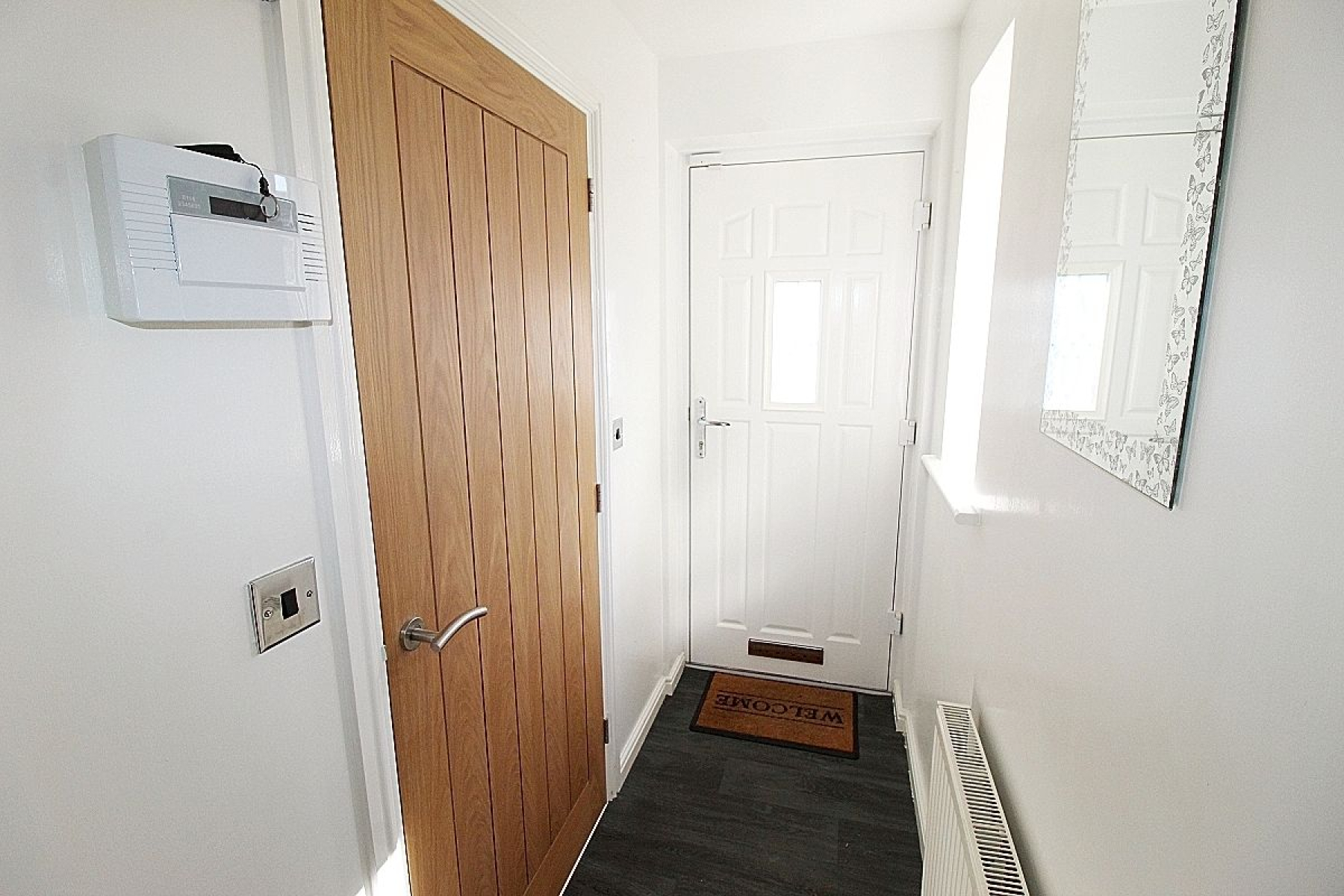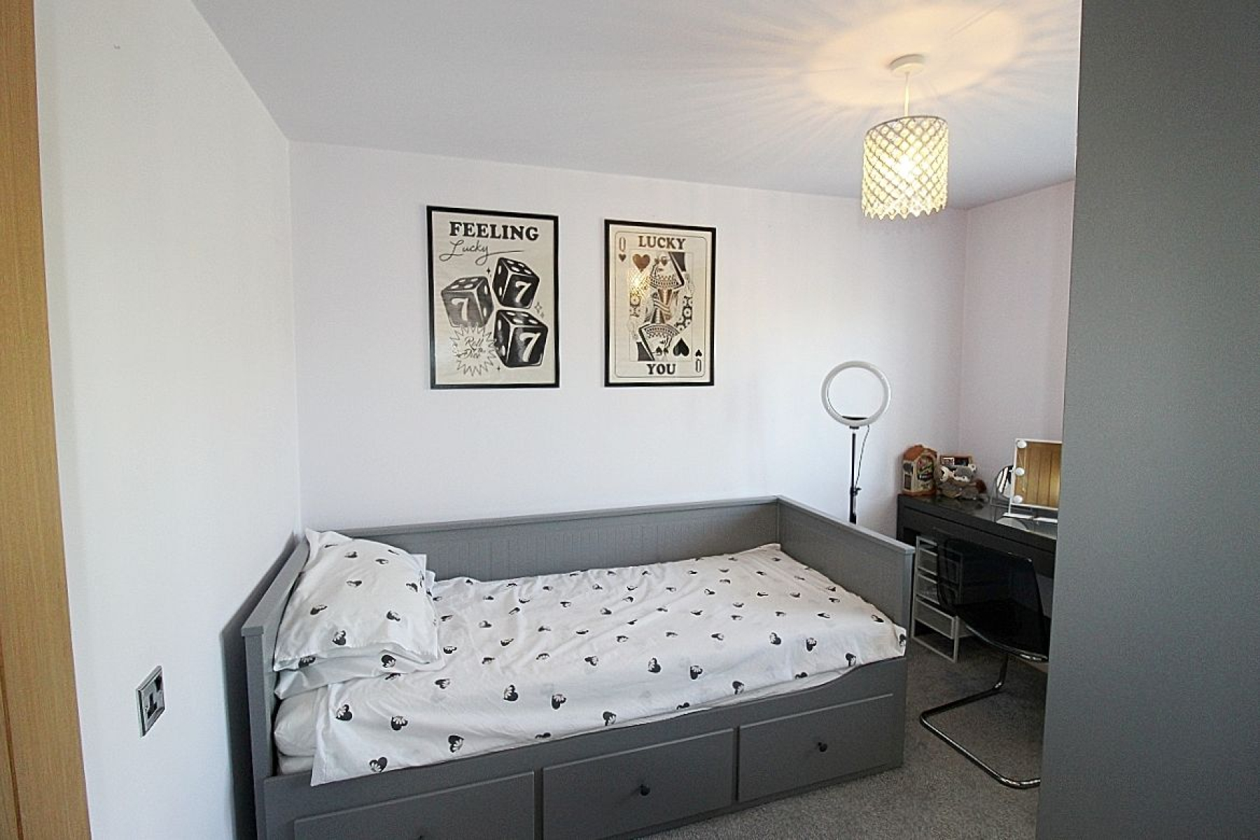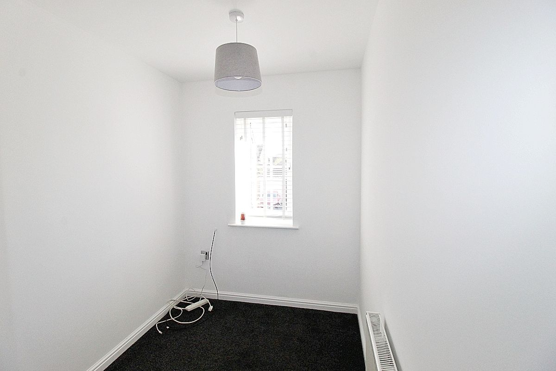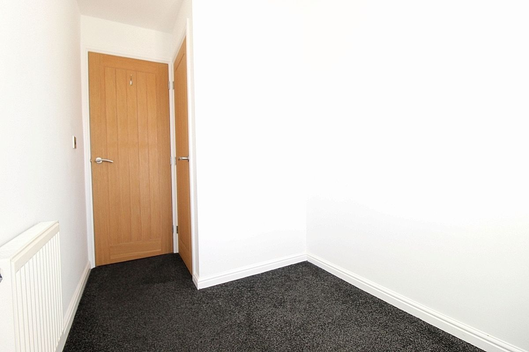 An ample sized third bedroom with carpeted flooring, radiator, front facing upvc window and a solid wood door to over stairs storage.