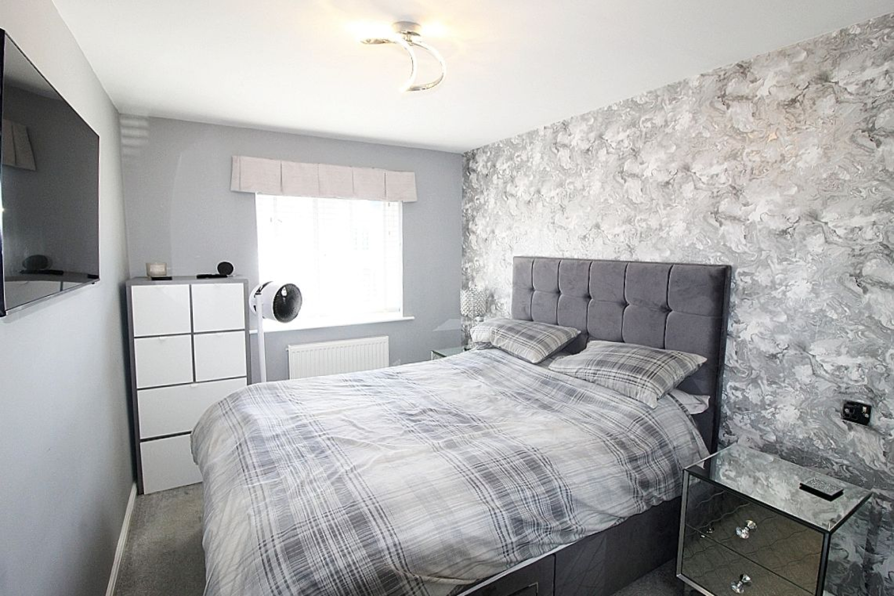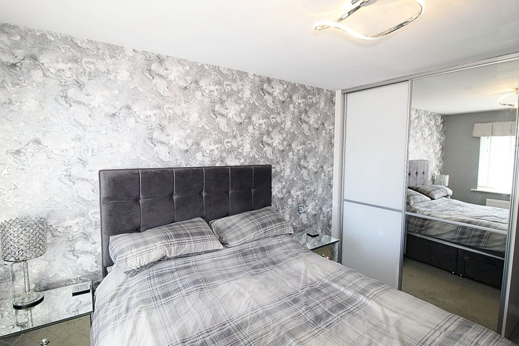 A further double bedroom with a range of fitted sliding wardrobes, carpeted flooring, radiator and a rear facing upvc window.