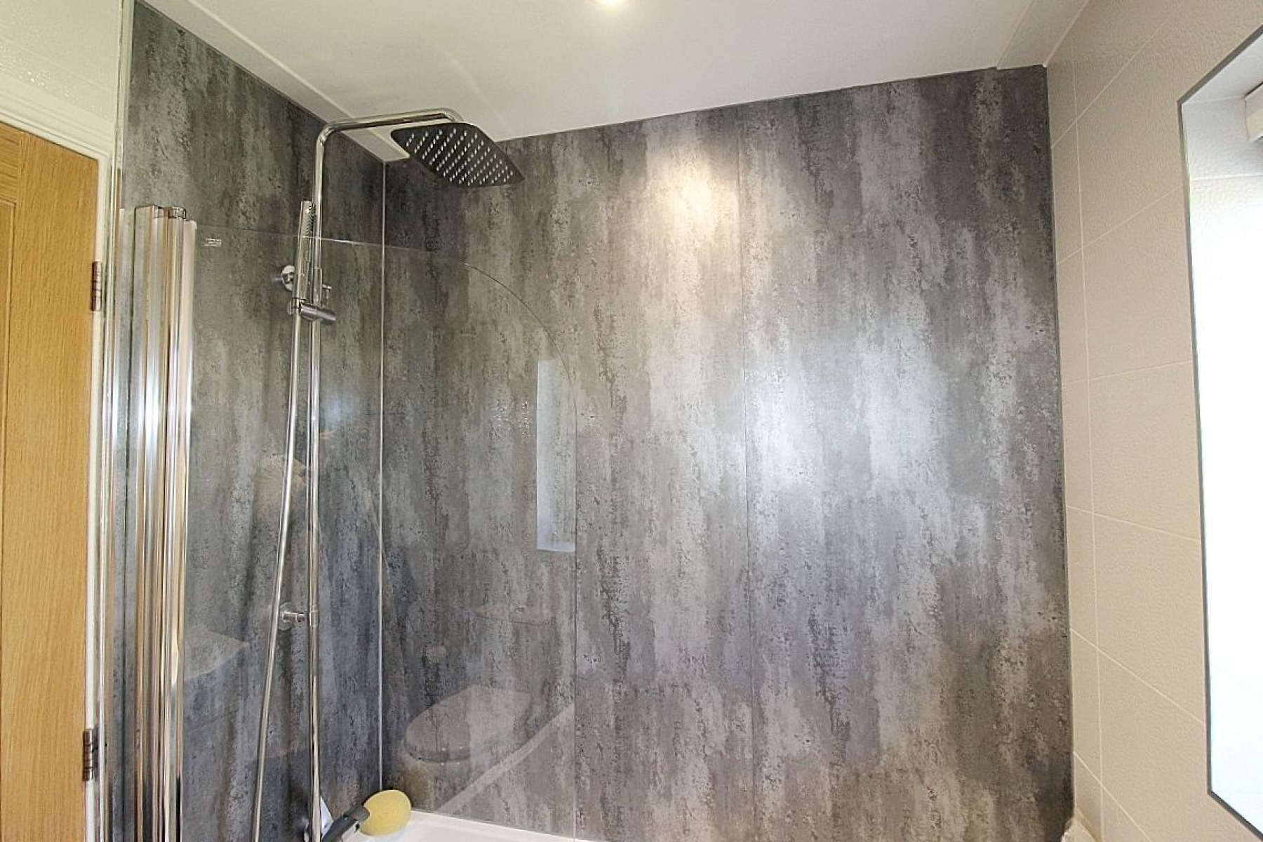 This modern bathroom comprises of a panelled bath with overhead shower and screen, vanity wash hand basin and a low level wc. Fully tiled walls with decorative panelling around the shower area, spot lighting, heated towel rail and a rear facing upvc window.